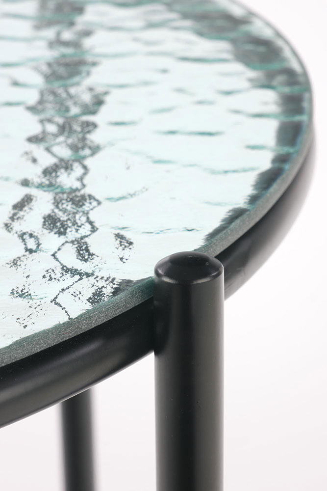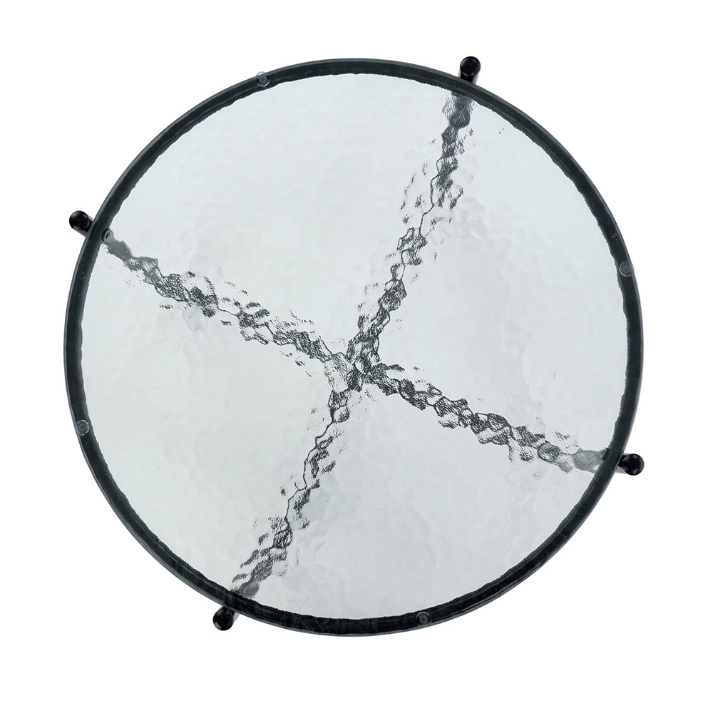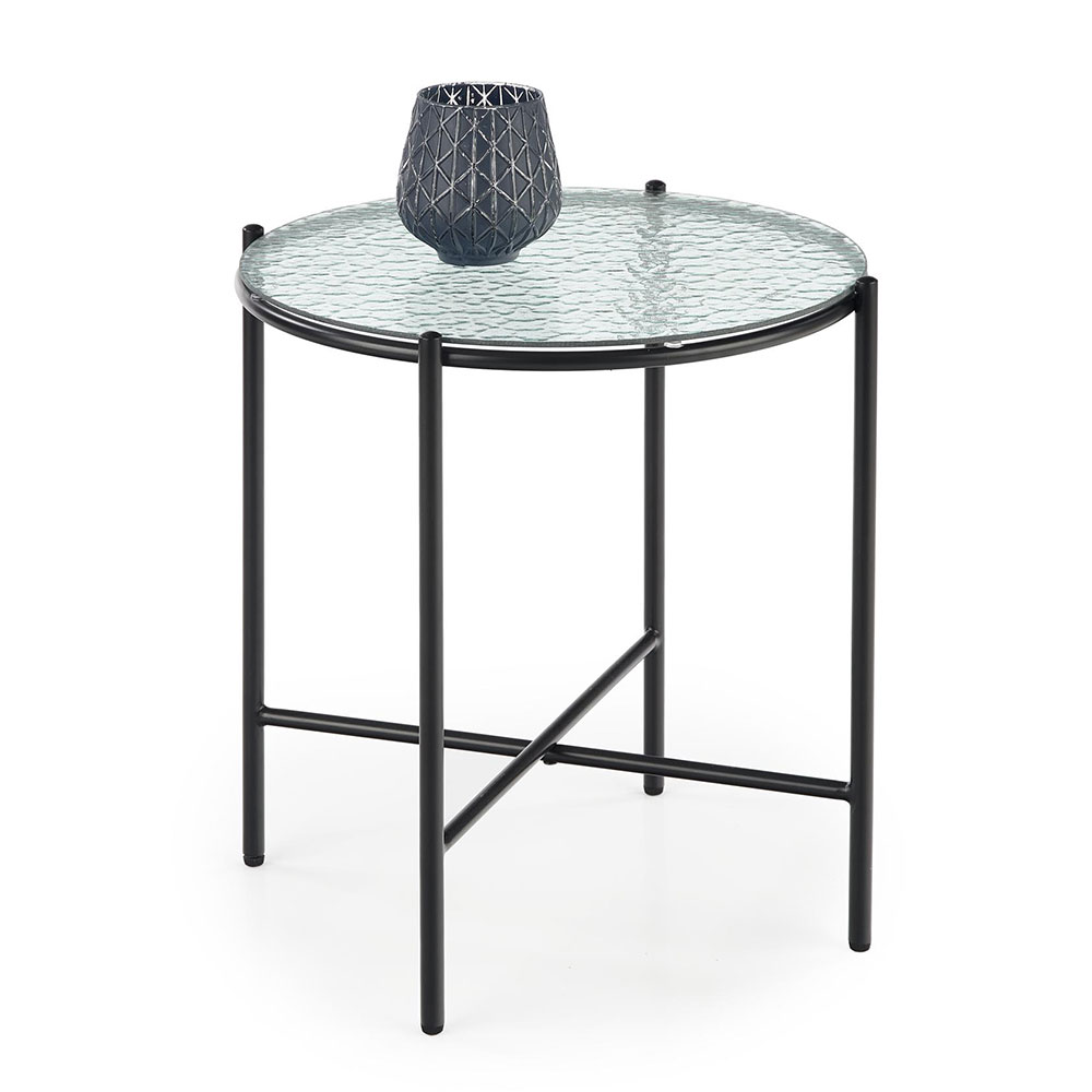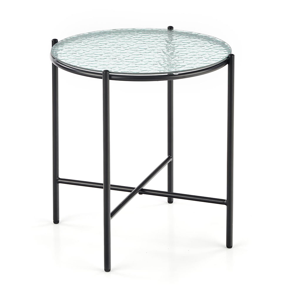 Кръгла холна маса с плот от релефно прозрачно стъкло и черна основа от метал.