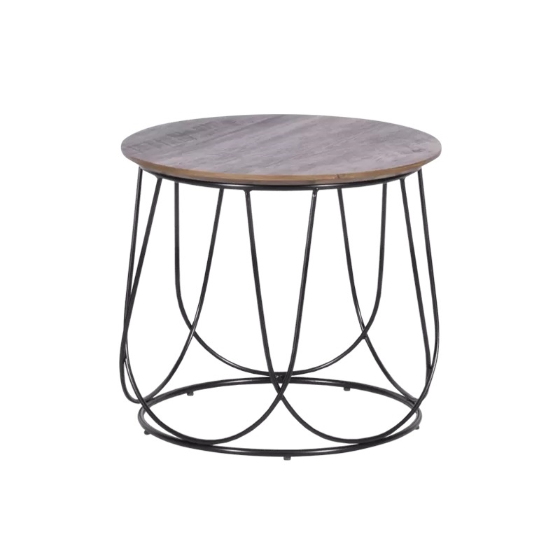 Малка кръгла холна маса с плот в цвят орех и метална основа.
