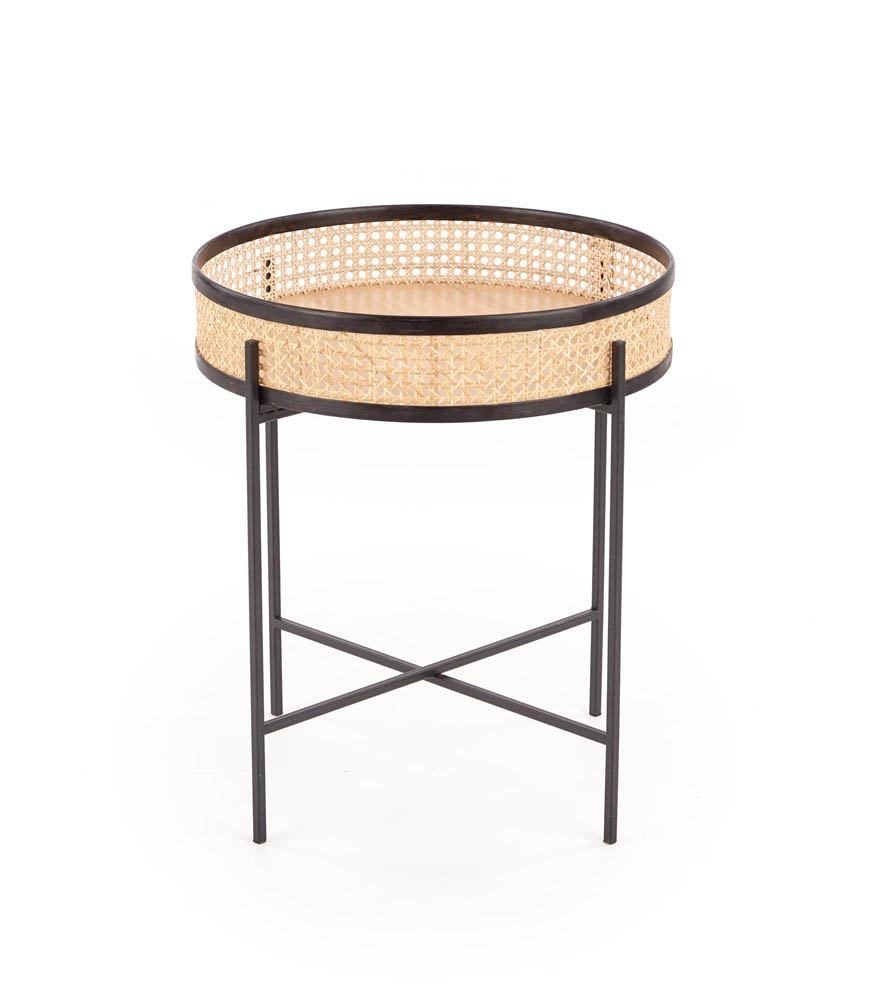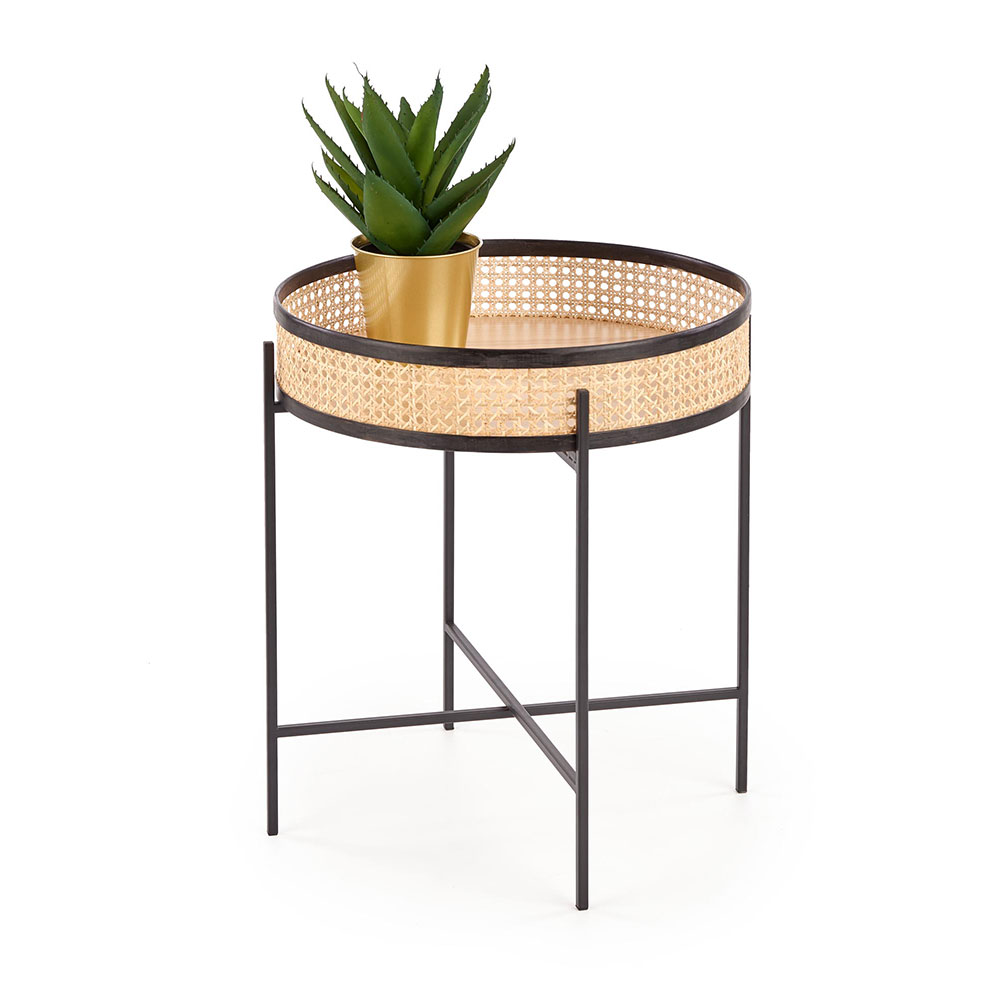 Кръгла холна маса с ратанов плот в естествен цвят тип табла и черна метална основа.