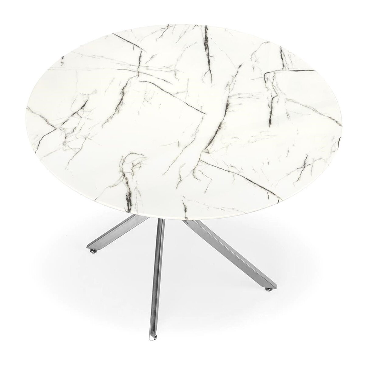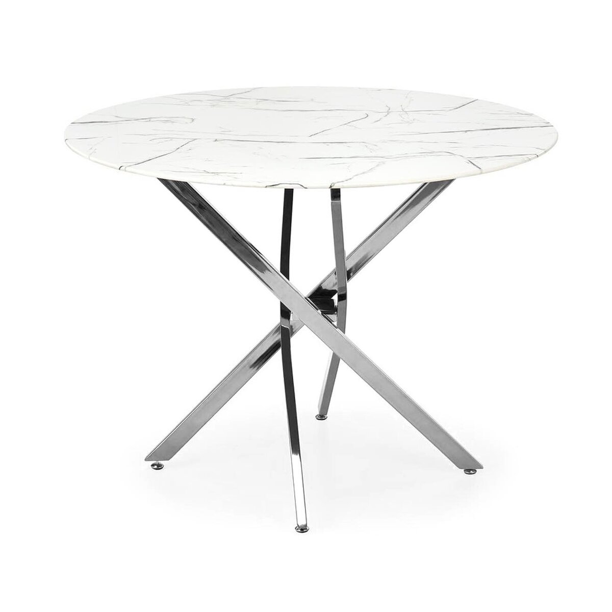 Кръгла маса с плот като бял мрамор и хромирани крака Родик.