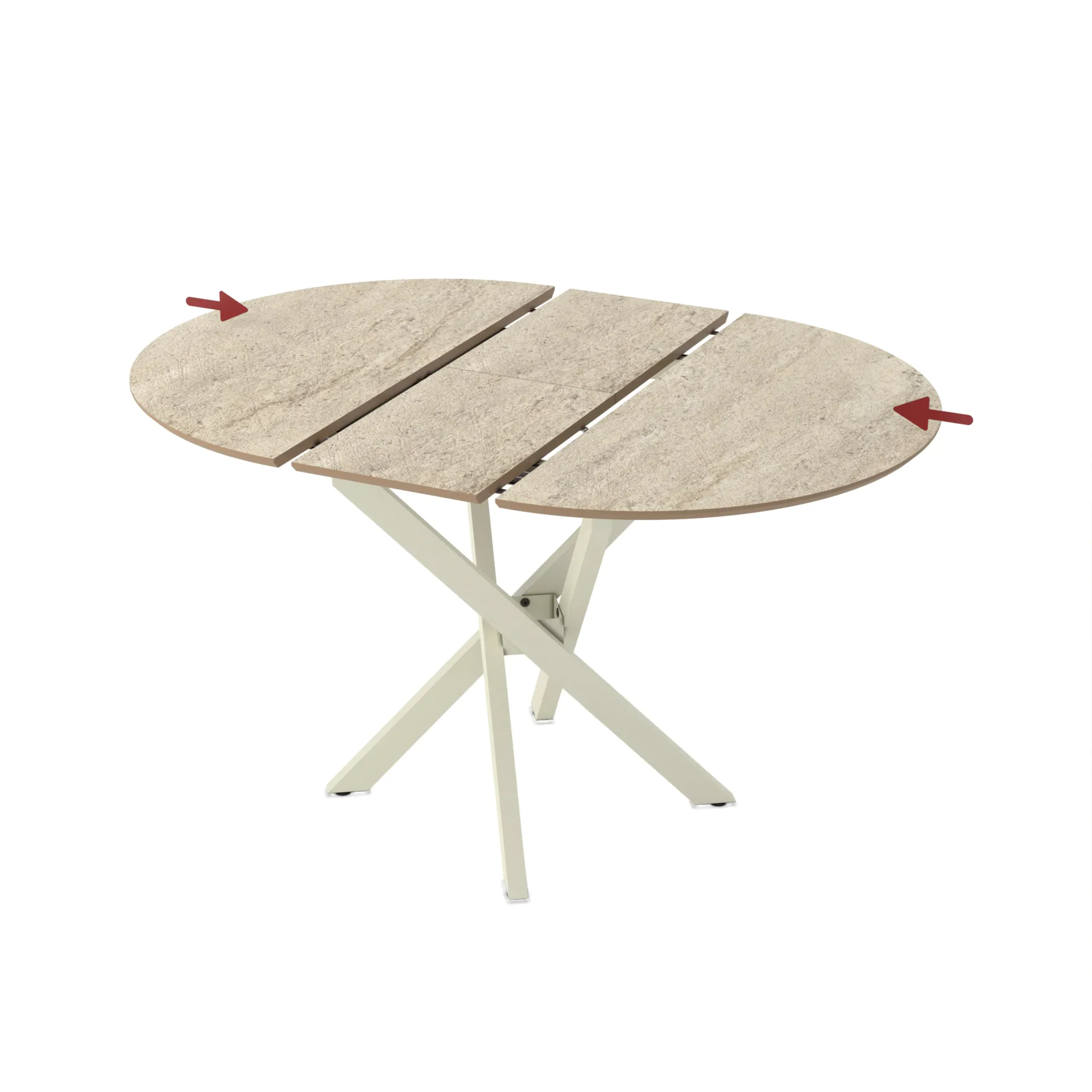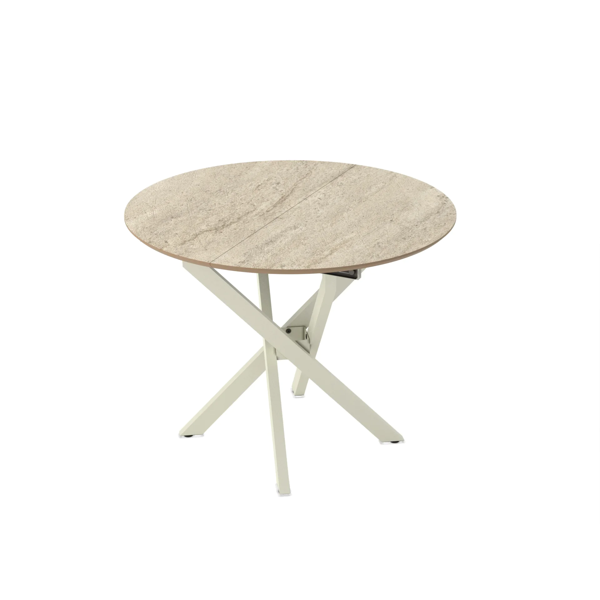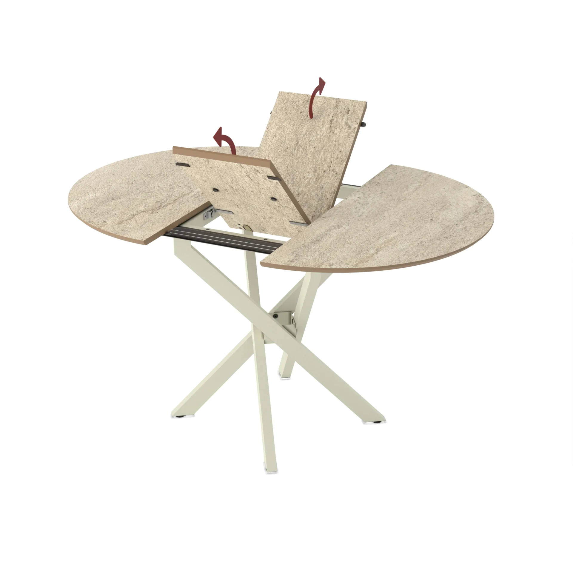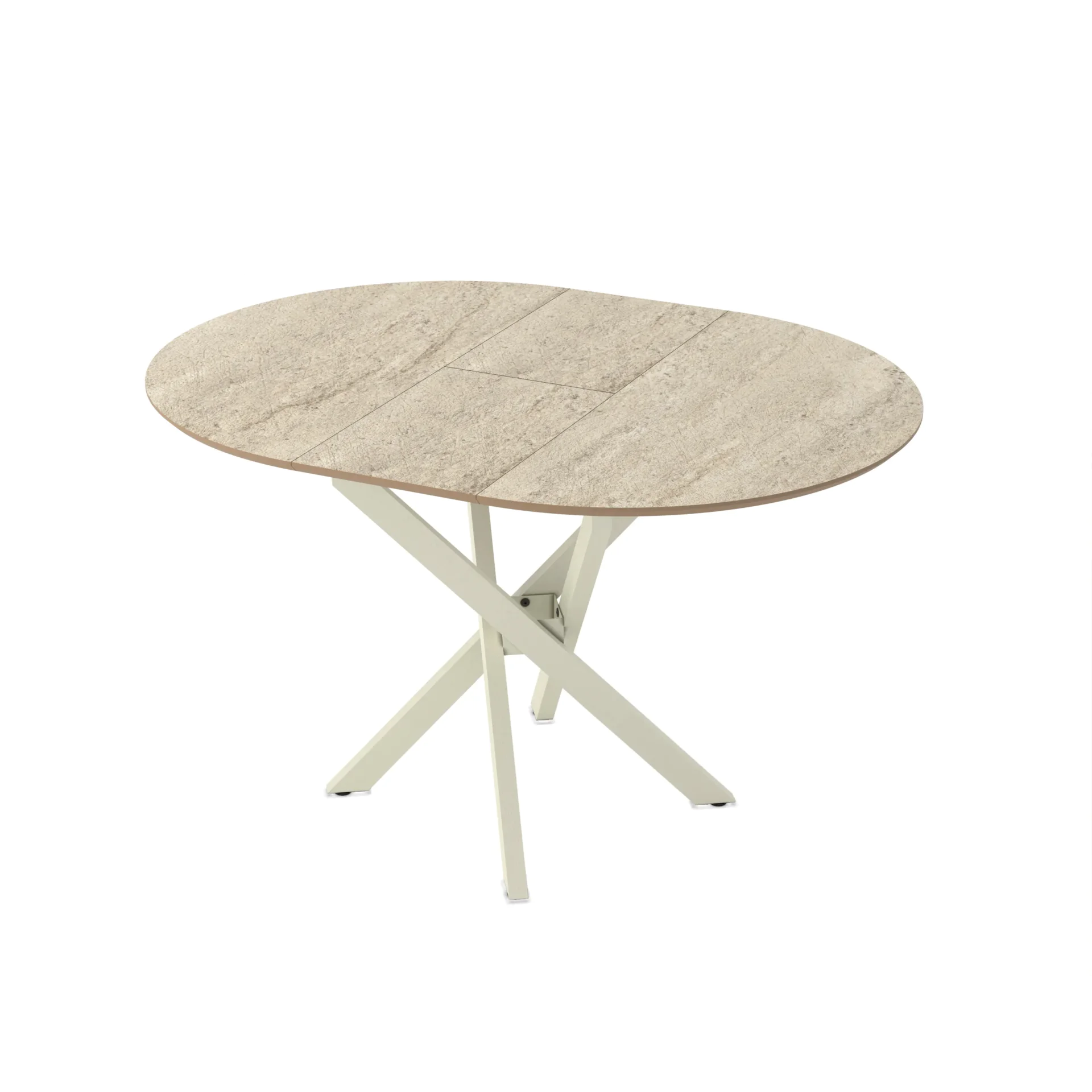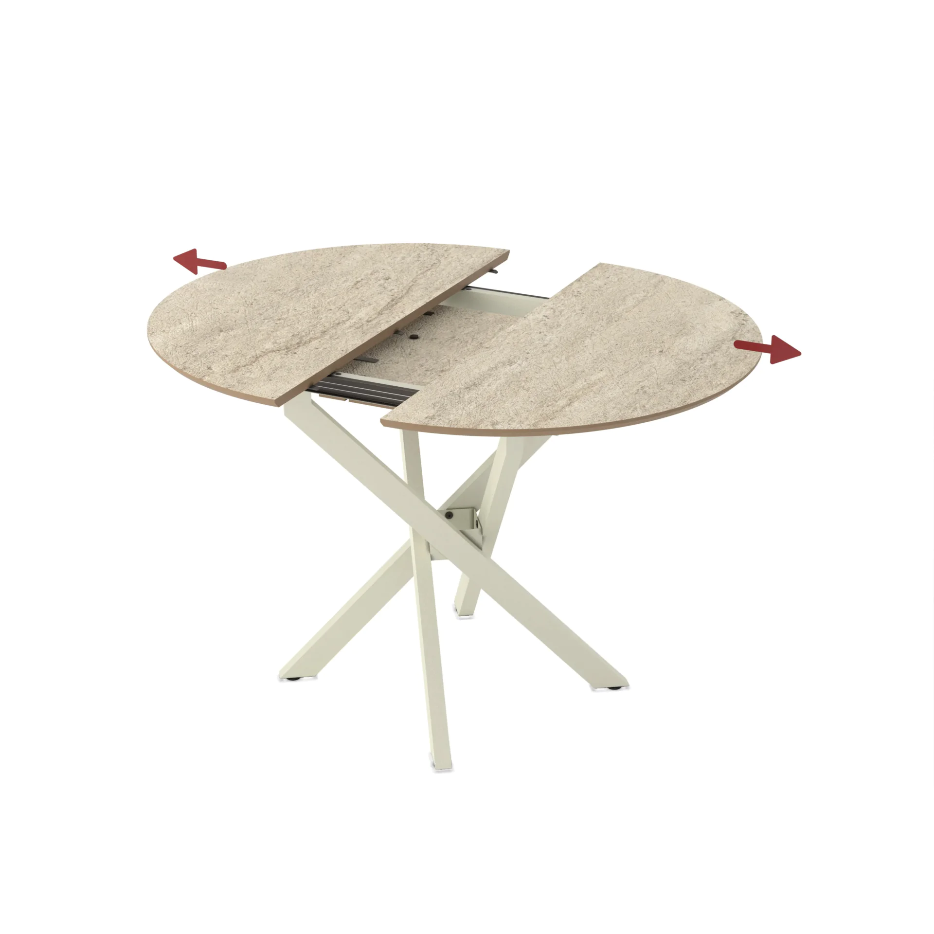 Конструкцията включва стабилни метални крака в цвят кашмир, оформени в кръстосана основа, осигуряваща добра стабилност. Разтегателният механизъм е интегриран в плота и позволява лесно увеличаване на полезната площ.
