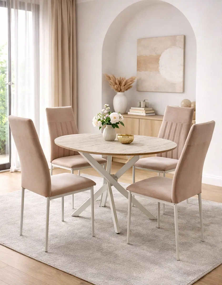 Кръгла маса с метални крака Ruta травертин е практично решение за трапезна зона, което съчетава функционалност и балансиран дизайн. Моделът е разтегателен, с плот от МДФ в цвят травертин, пресъздаващ естествена каменна визия с фина текстура и топъл тон.