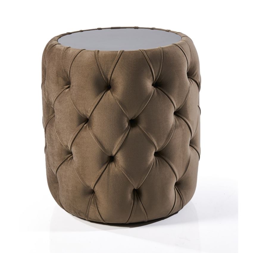 Кръгла нощна масичка със стъклен плот, изработена с конструкция от МДФ и капитонирана мека дамаска в кафяв цвят.