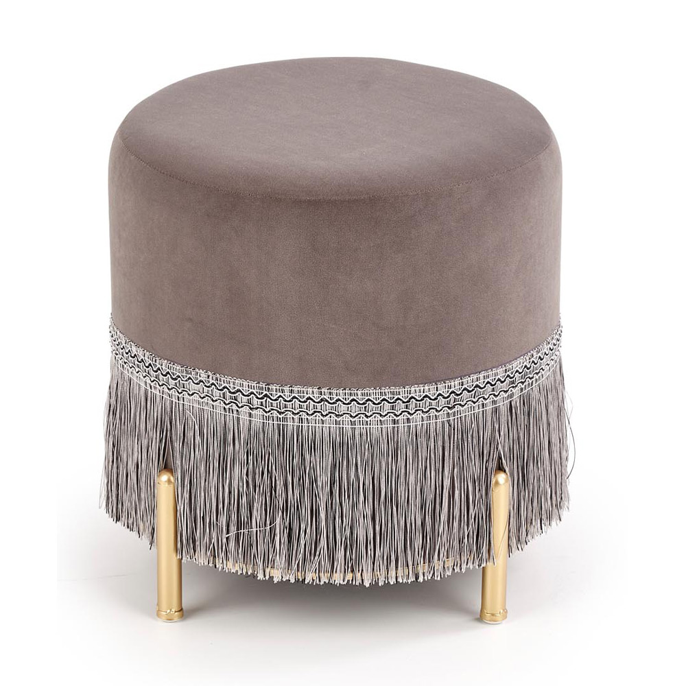 Кръгла плюшена табуретка с декорация от ресни и златисти крачета, която се предлага в два цвята – светлосин и сив.