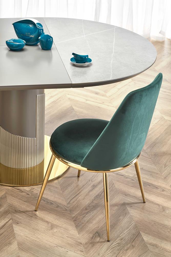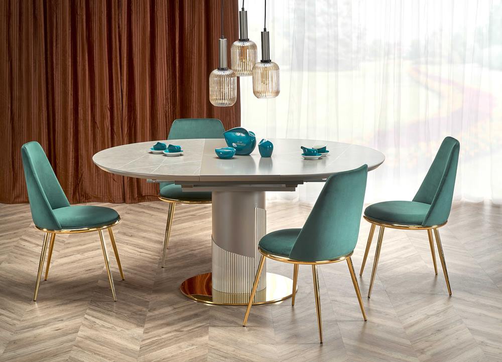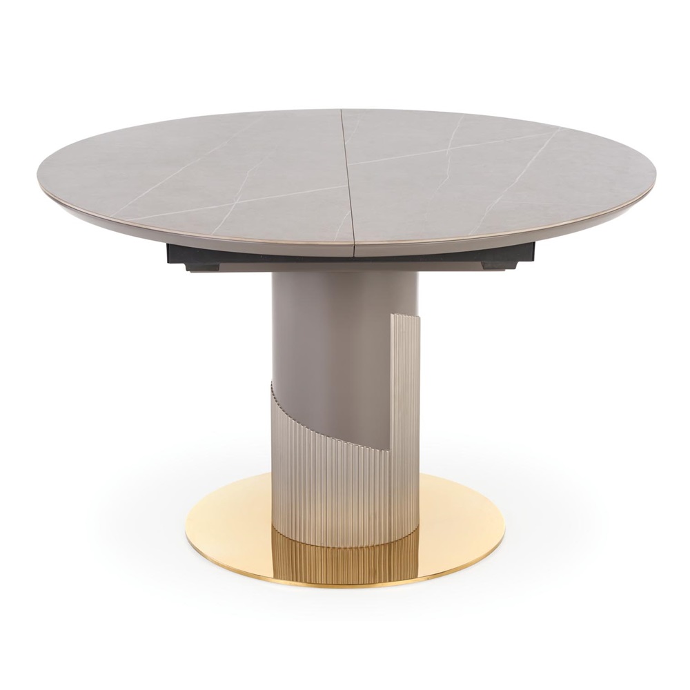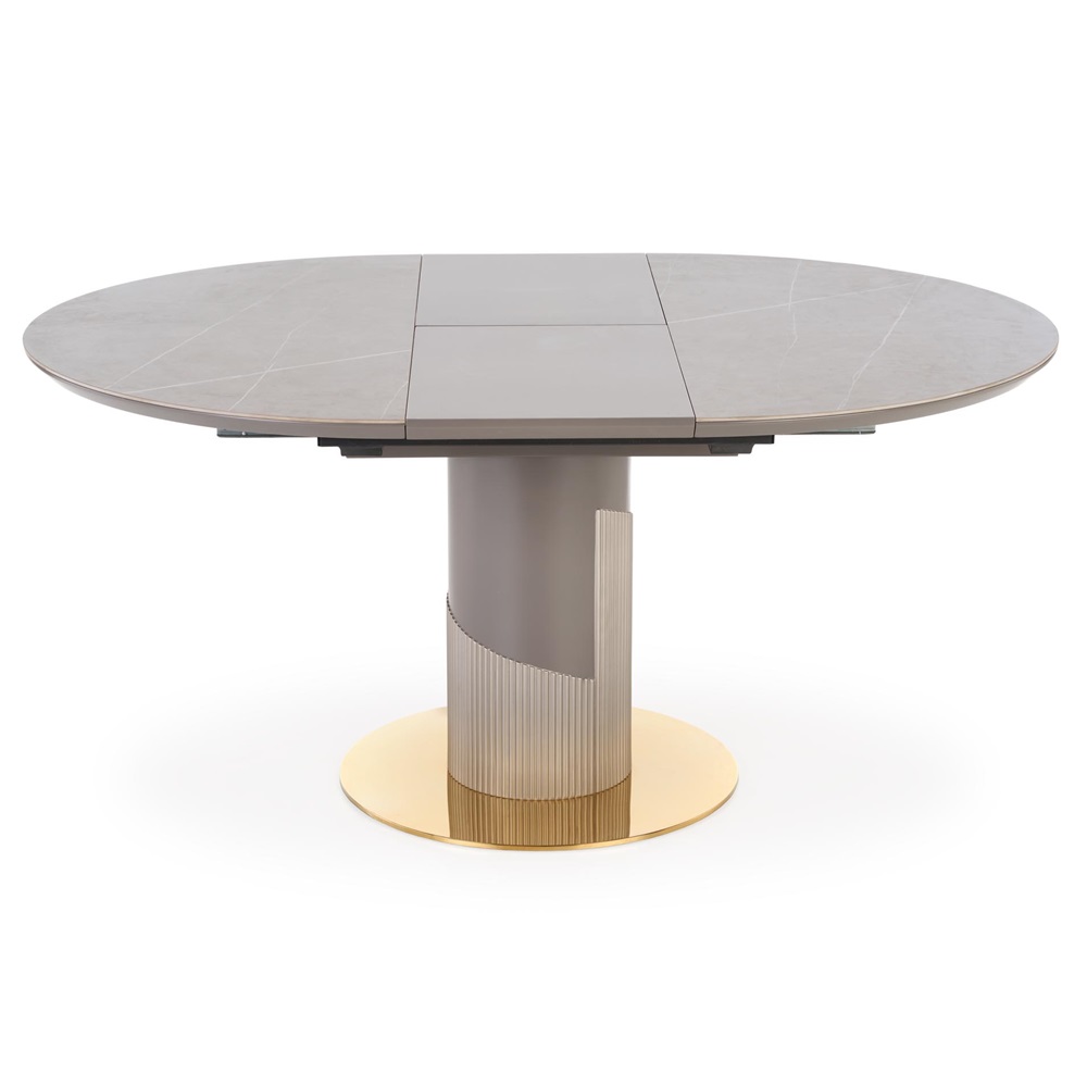 Кръгла разтегателна трапезна маса с плот като сив мрамор и основа в светлосиво и златисто.
