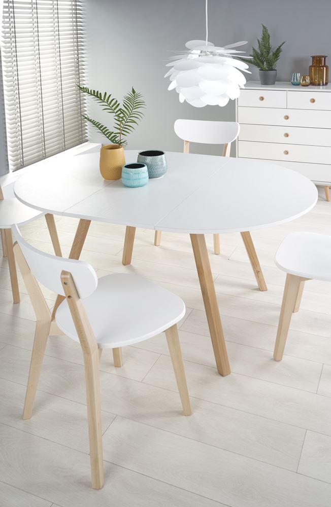 Кръгла трапезна маса с опция за разтягане, изработена в два варианта: с бял матиран плот от МДФ и елегантни крака от масивно буково дърво или с плот в цвят занаятчийски дъб с черни крака от букова дървесина.