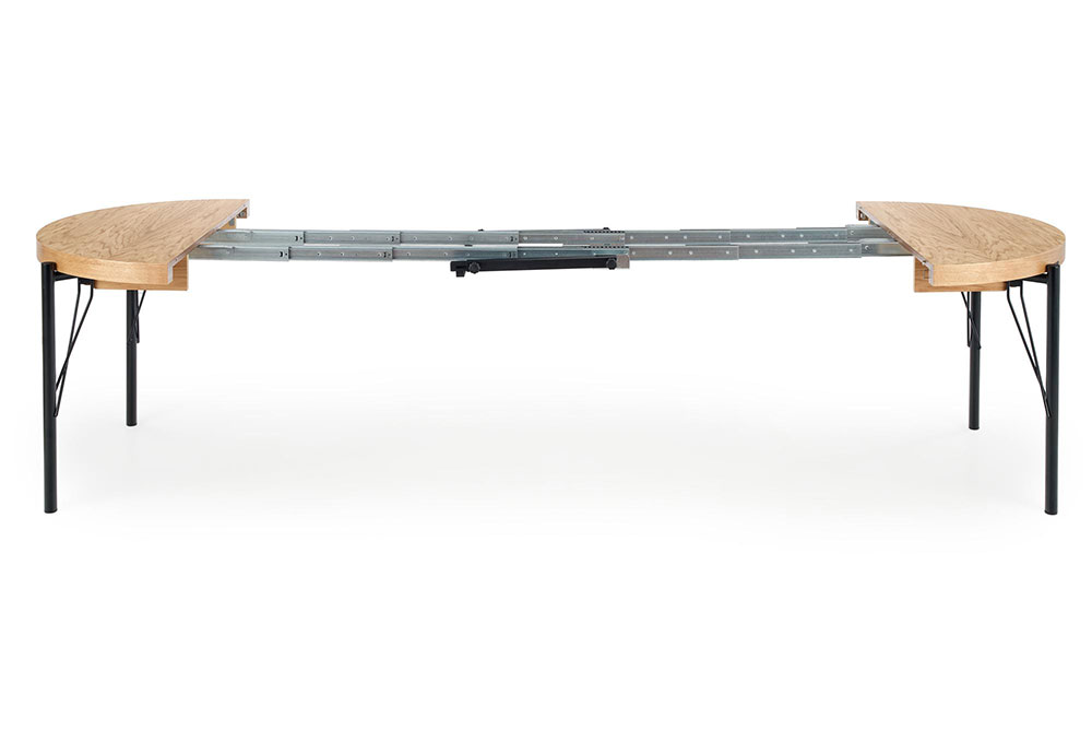 Кръгла трапезна маса с дълъг разтегателен плот, изработена от МДФ с естествен фурнир в цвят натурален дъб и основа от черен метал.