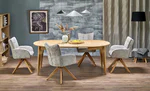 Плотът на масата е изработен от мебелна плоскост с естествен дъбов фурнир, който подчертава структурата на дървото и създава топло излъчване. Краката са от масивна дървесина и осигуряват надеждна опора при ежедневна употреба.
