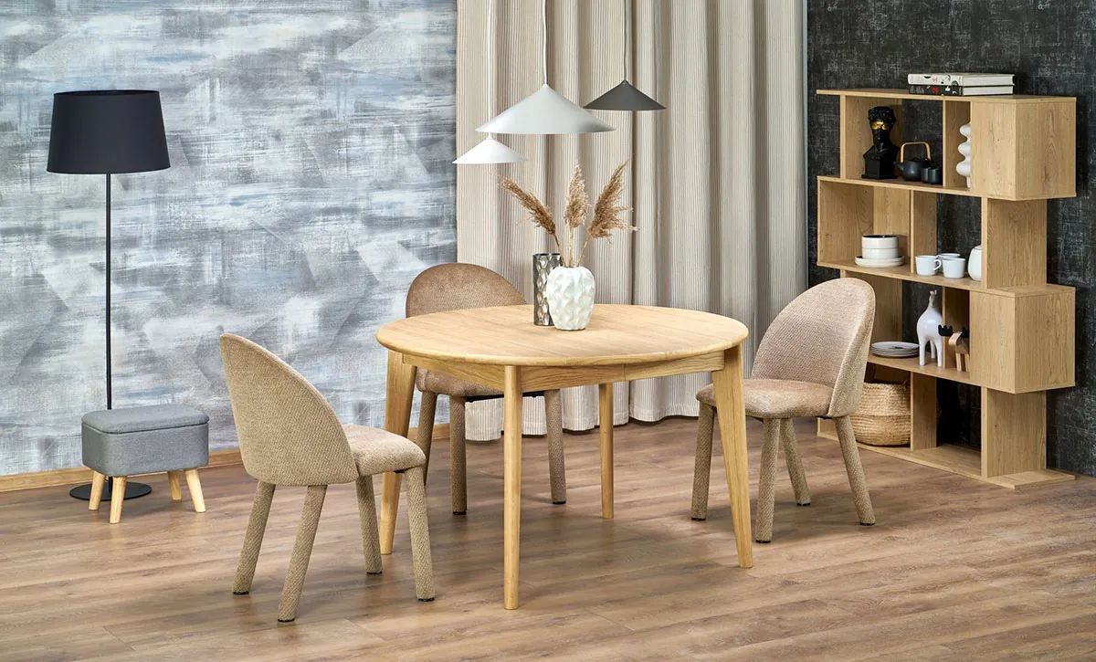 Кръгла трапезна маса с опция за разтягане M105 е подходящ избор за помещения, в които е нужна функционална маса с компактна форма.