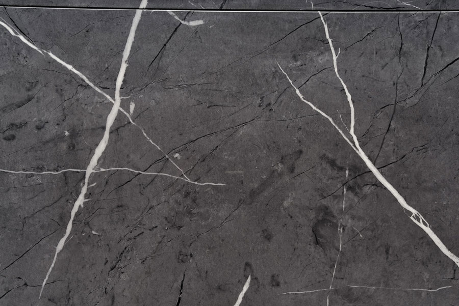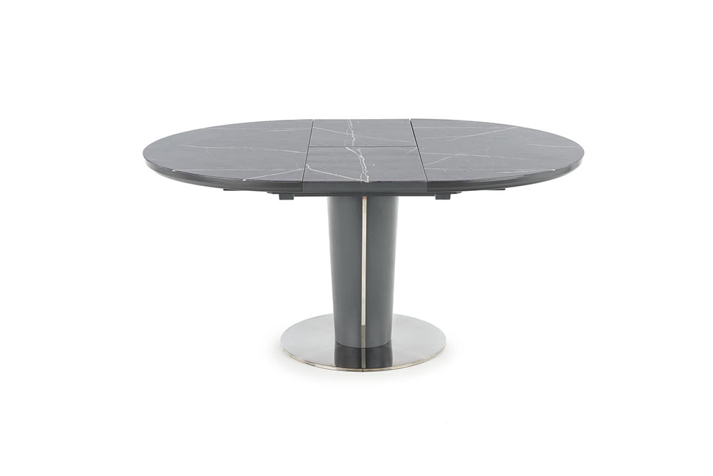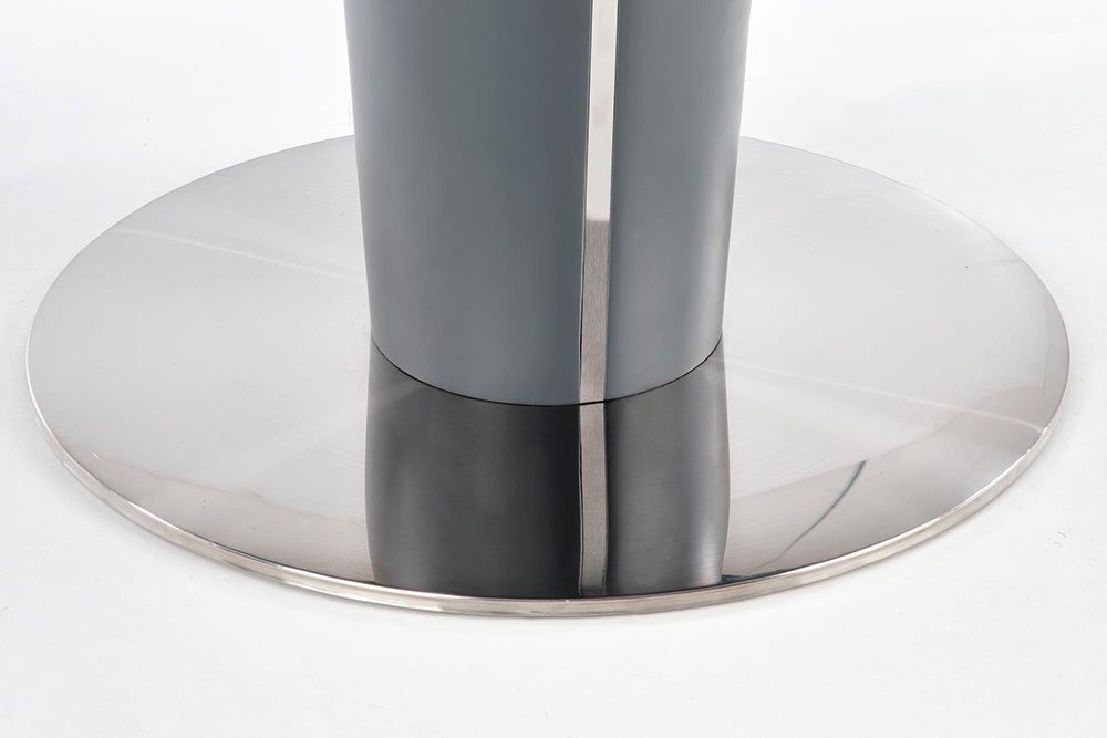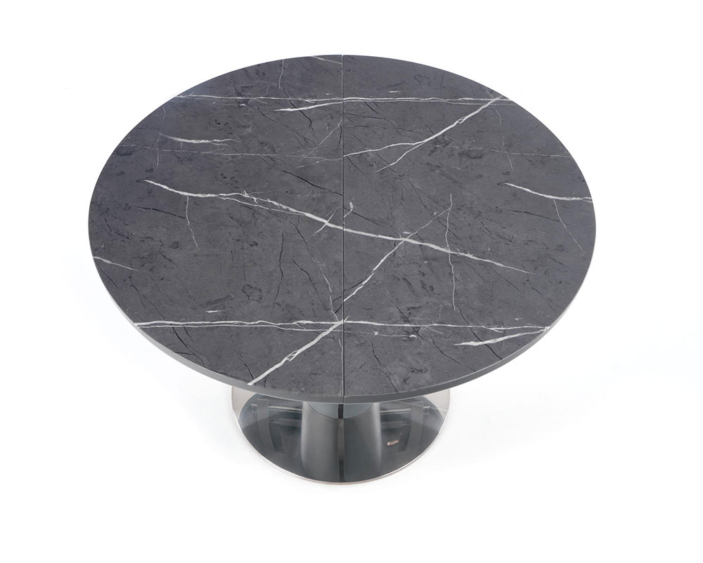 Кръгла трапезна маса с МДФ плот в цвят сив мрамор, покрит със стъкло върху метална основа в тъмносив цвят.