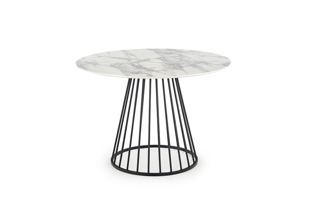 Кръгла трапезна маса с плот от МДФ в цвят бял мрамор и метална решетъчна основа като конус в черно.