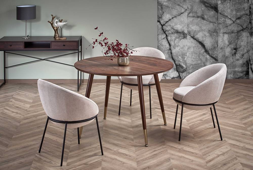 Елегантна кръгла трапезна маса с плот в цвят орех и златисти детайли по краката.
