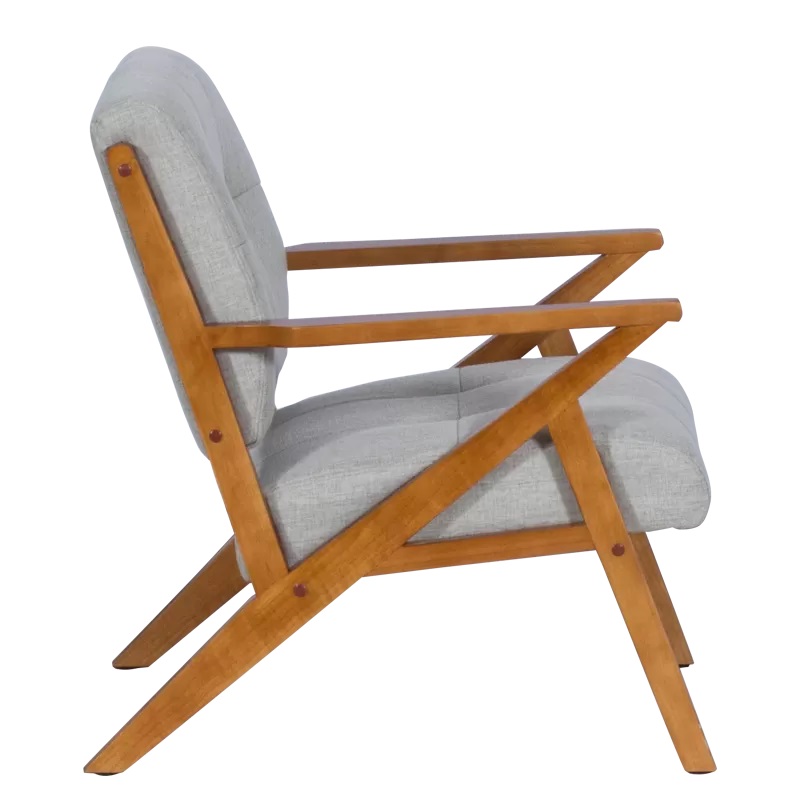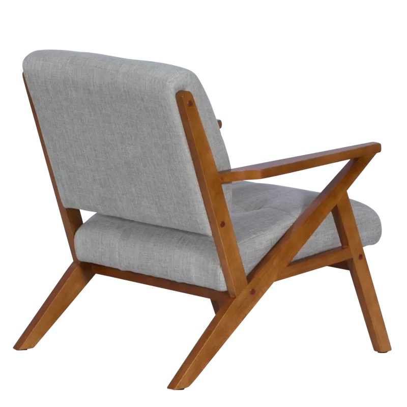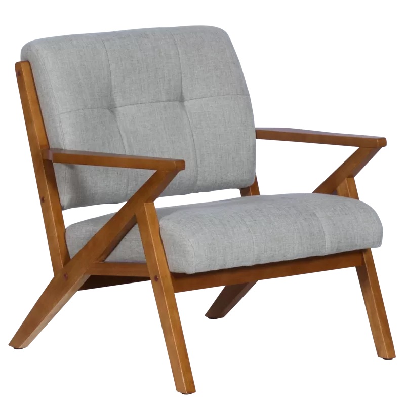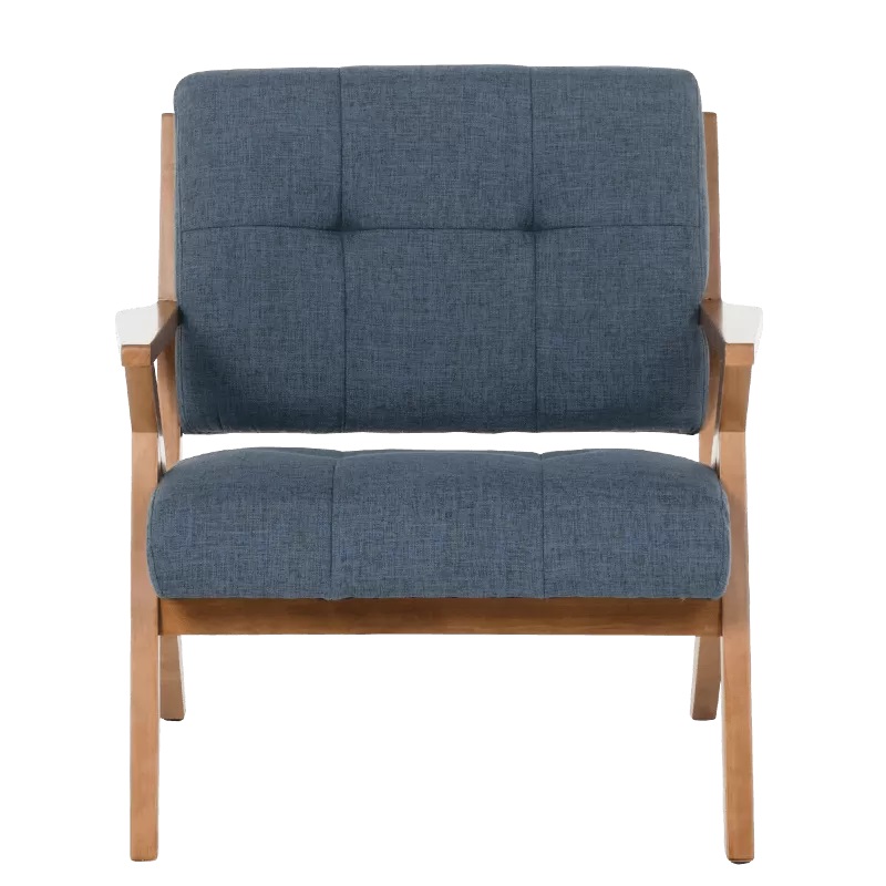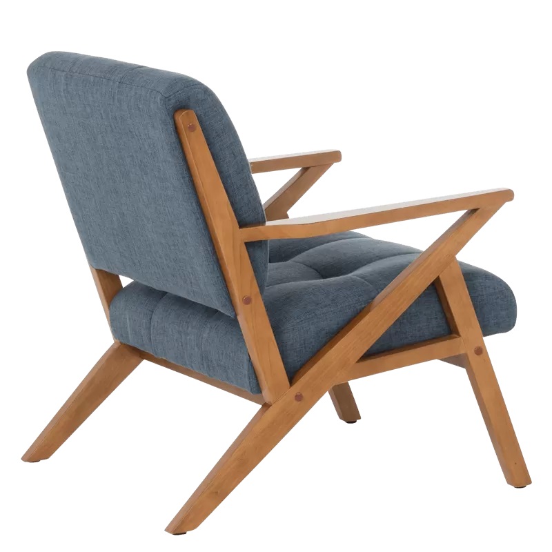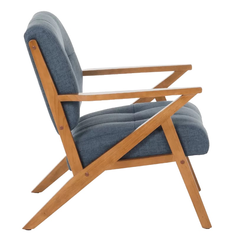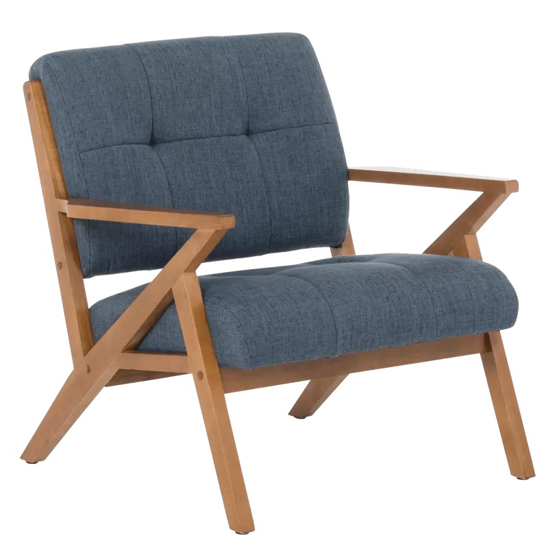 Кресло от дърво и текстил, изработено в цветови комбинации орех и синьо или орех и сиво.