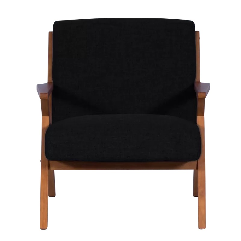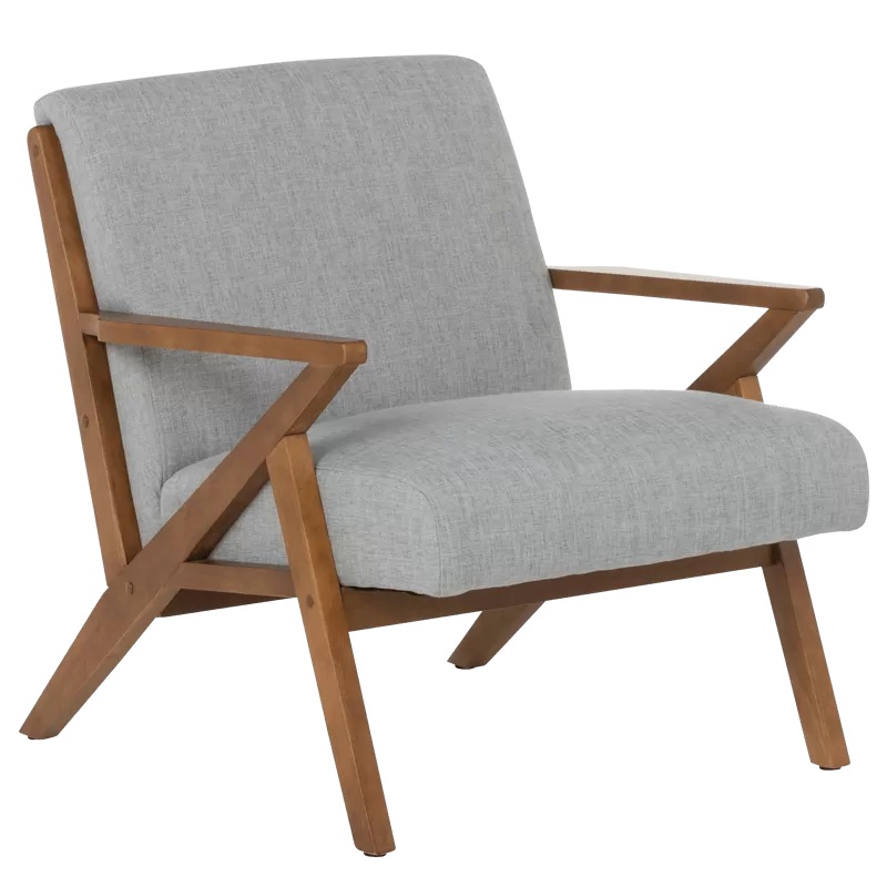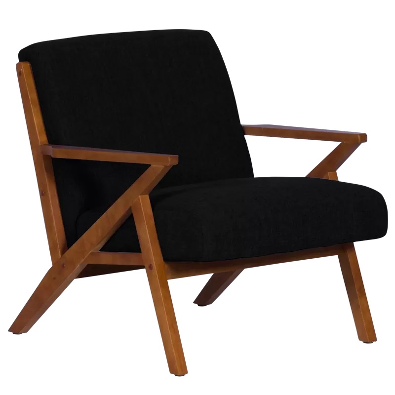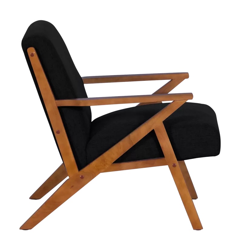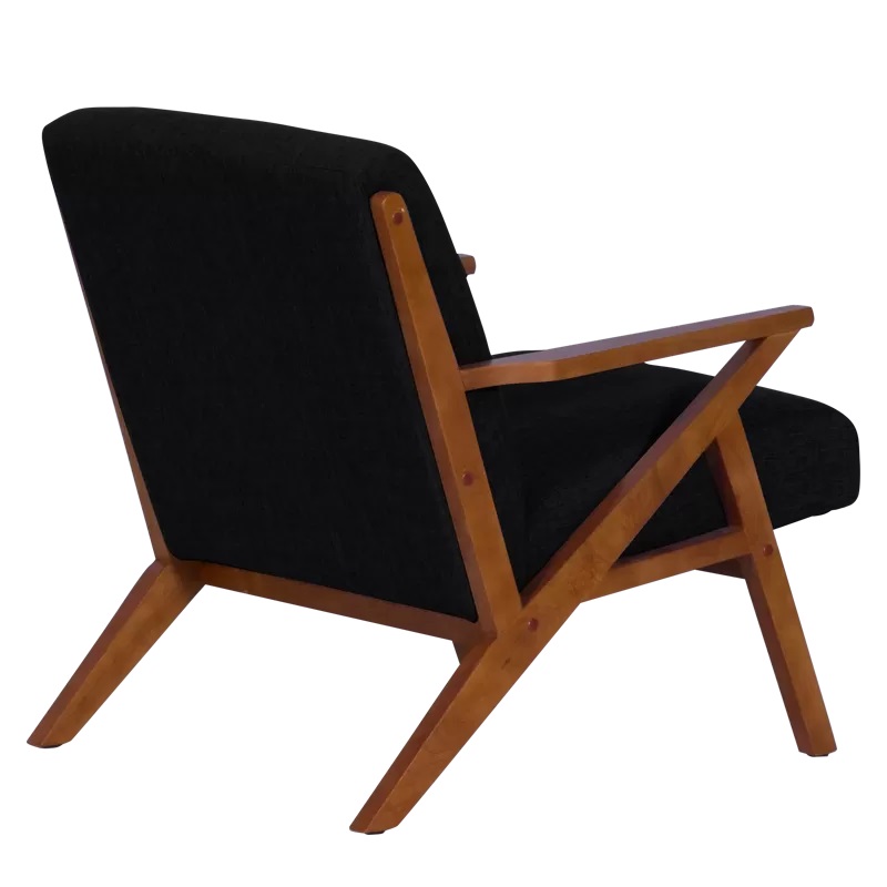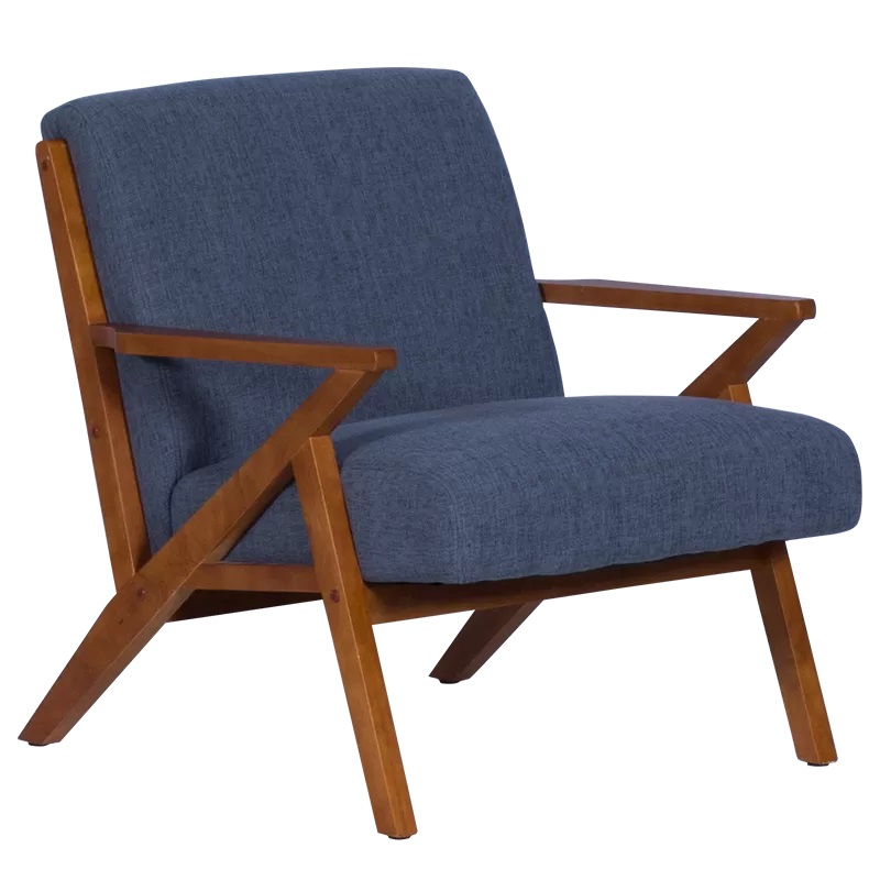 Кресло от дърво и текстил, изработено в три цветови комбинации орех и синьо, орех и черно или орех и сиво.
