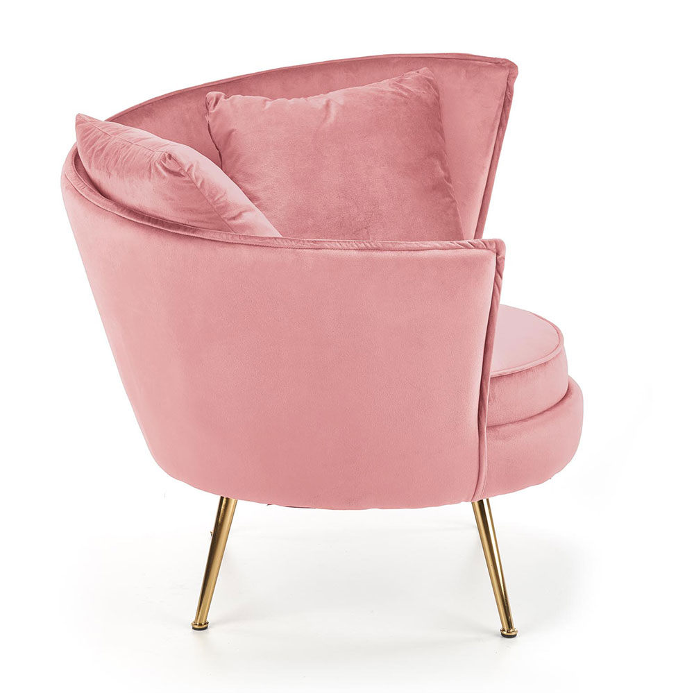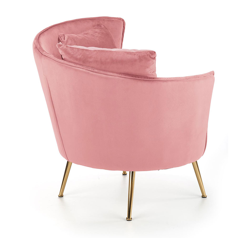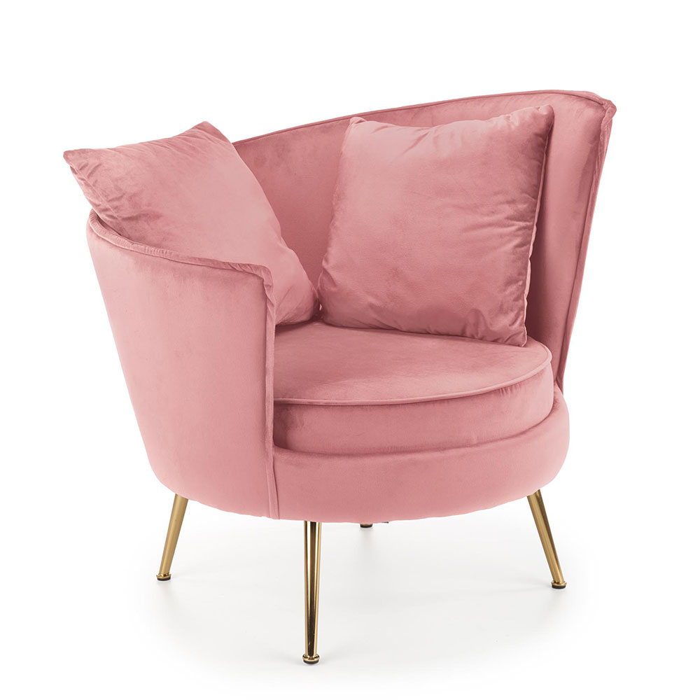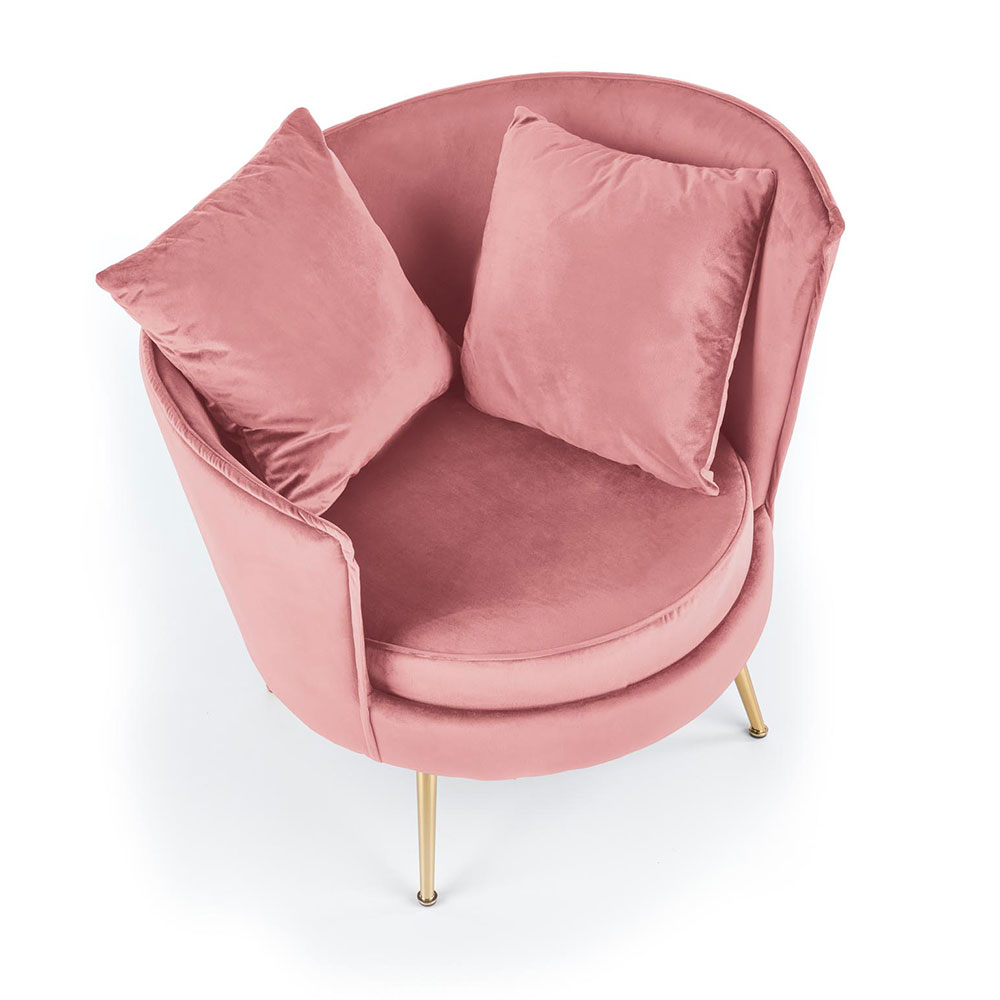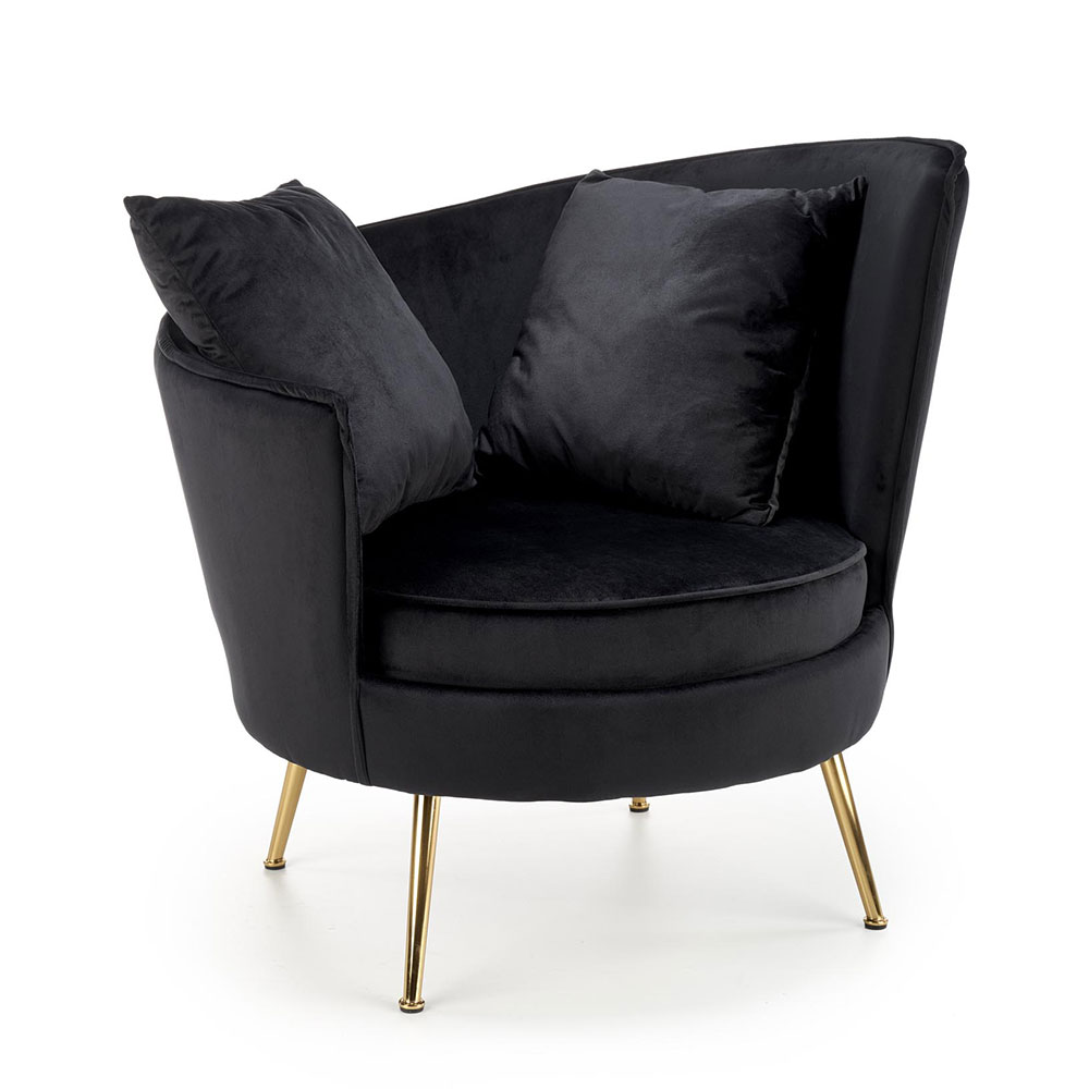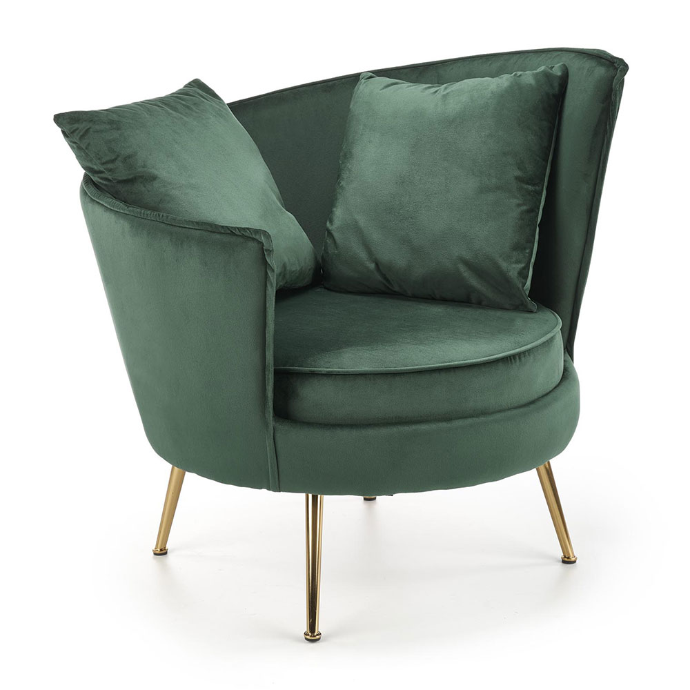 Кресло с дамаска от кадифе, интересна облегалка, две възглавнички и златисти крака от хромирана стомана.