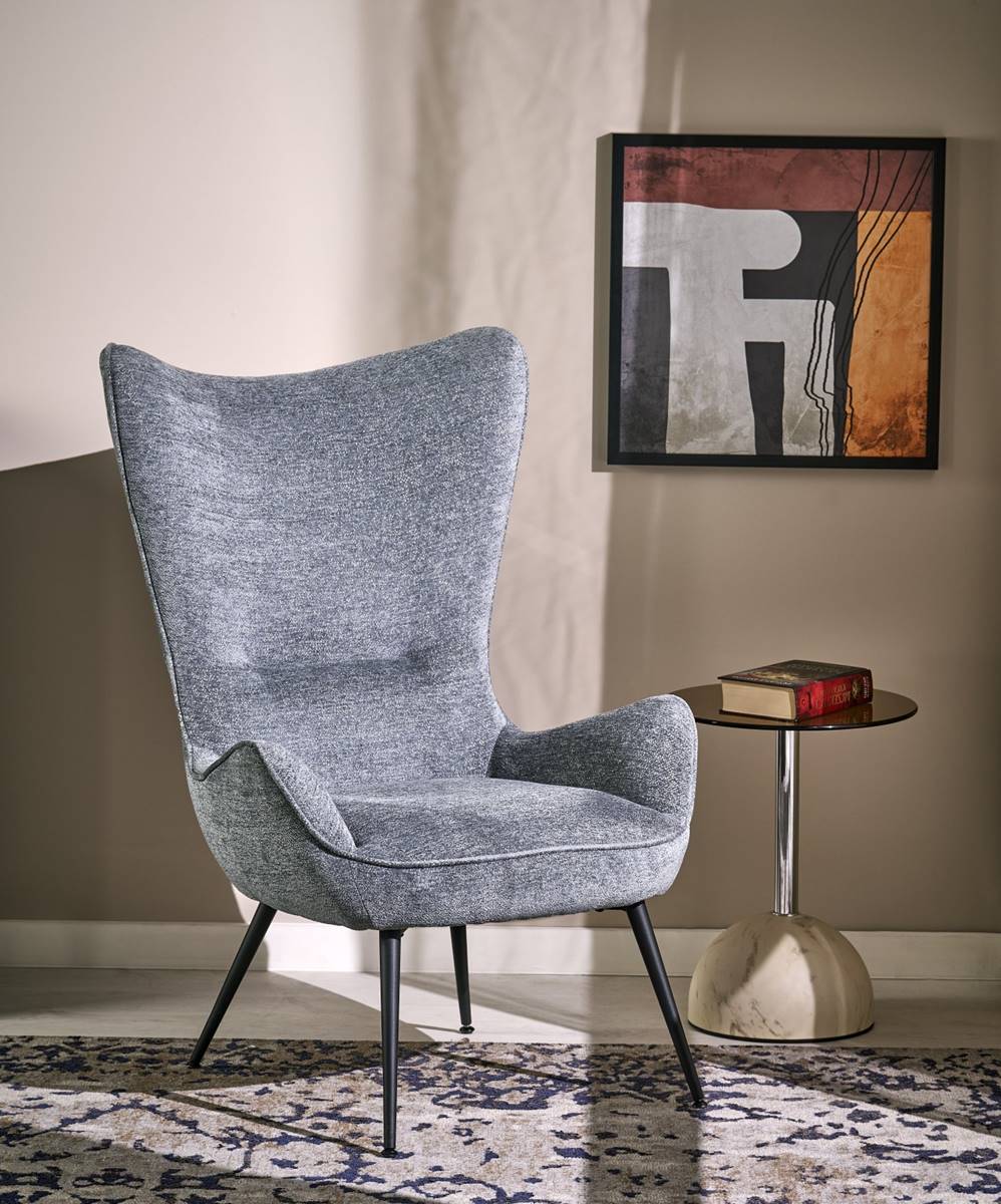 Кресло от текстил с висока облегалка, изчистена линия и елегантен дизайн.
