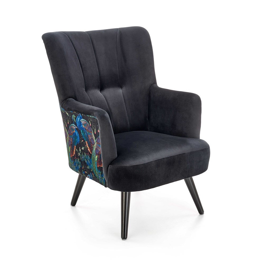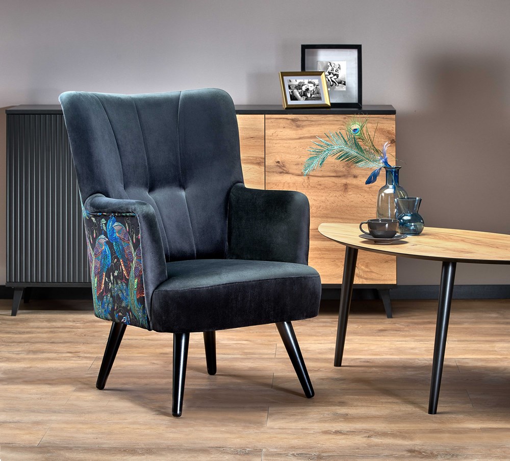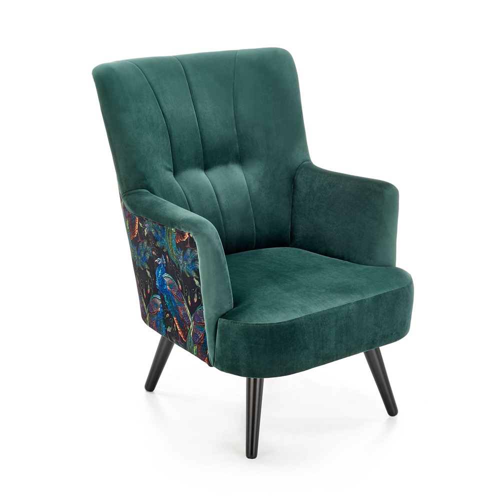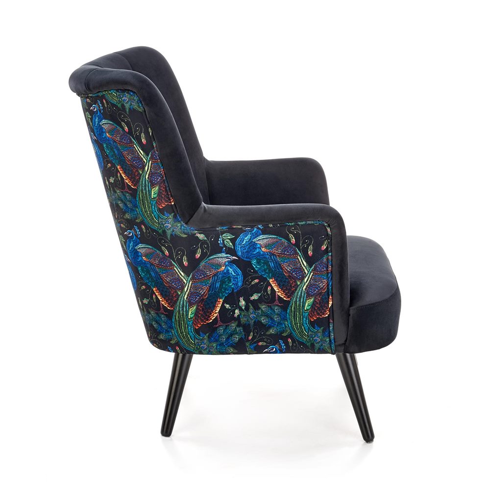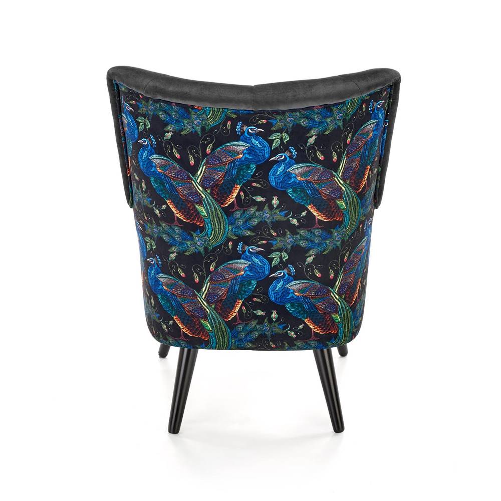 Кресло с кадифена дамаска и многоцветен гръб с принт на птици.