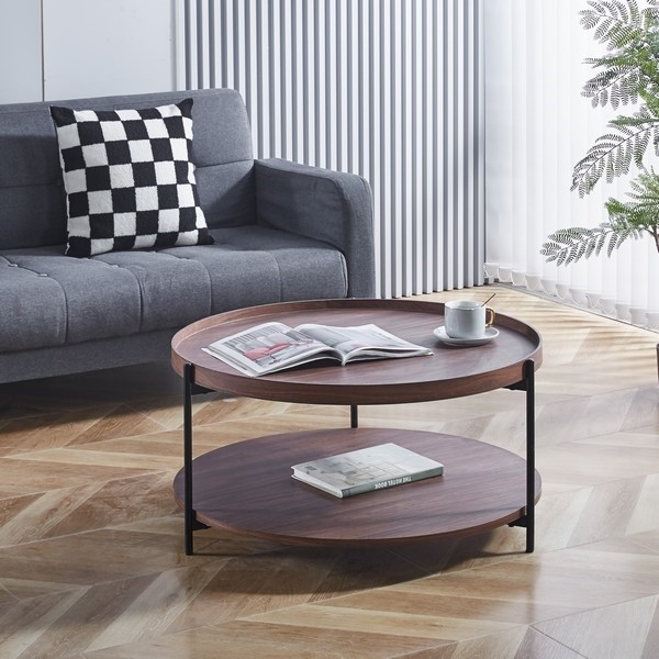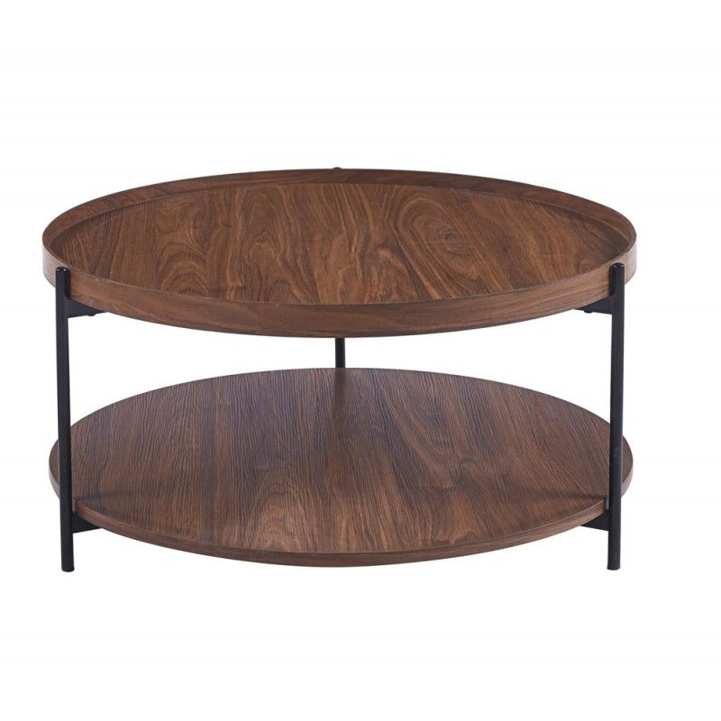 Кръгла холна маса с два плота в цвят орех, изработена от МДФ и метална конструкция в черно.