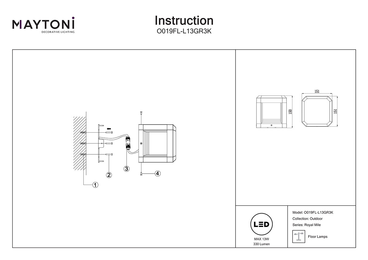 LED градинска лампа, изработена от алуминий в сив цвят с квадратна форма Maytoni, серия Royal Mile.