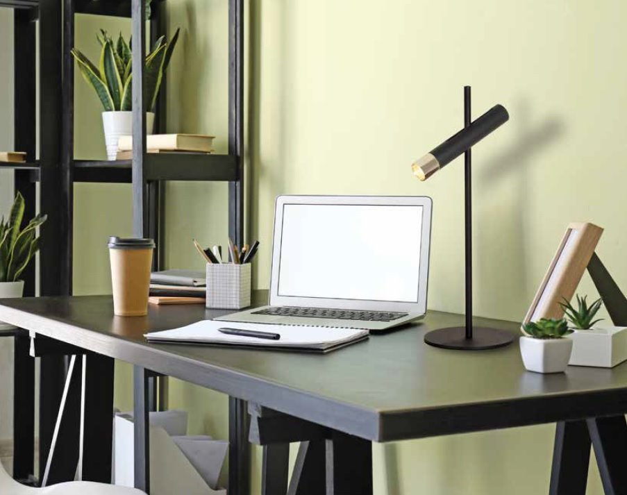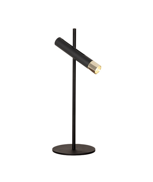 Модерна LED настолна лампа в черен цвят, изработена от метал с кръгла основа и подвижно цилиндрично тяло с месингов детайл Zambelis, серя Porter.