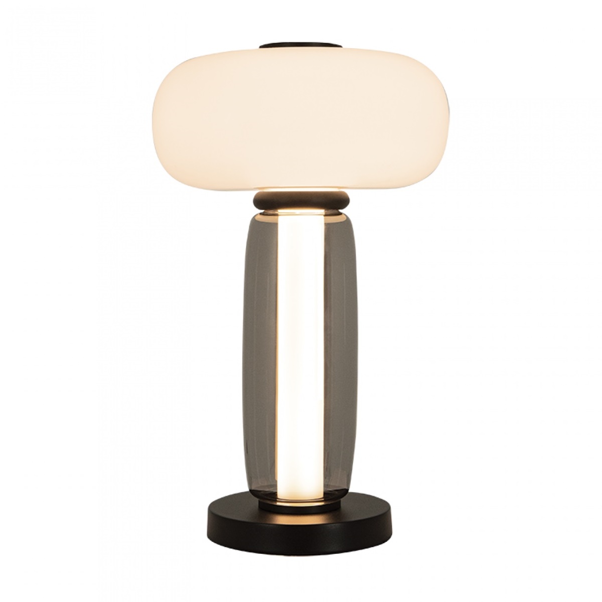 Стилна LED настолна лампа с модерен дизайн, изработена с метална основа в черен мат и елегантно цилиндрично тяло от опушено стъкло, Zambelis.