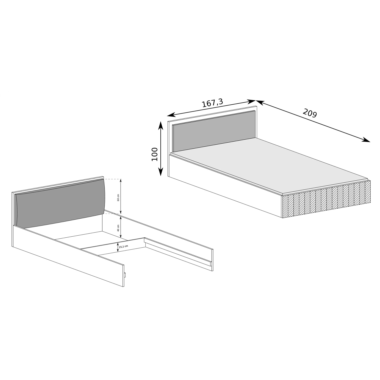 Леглото се предлага в два размера, подходящи за матраци 140×200 см и 160×200 см, което позволява лесен избор на вариант според вашето пространство и нужди.