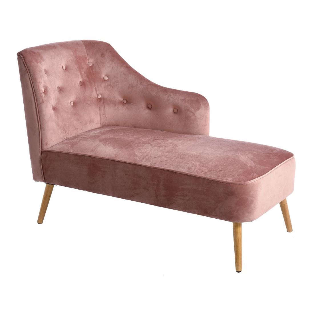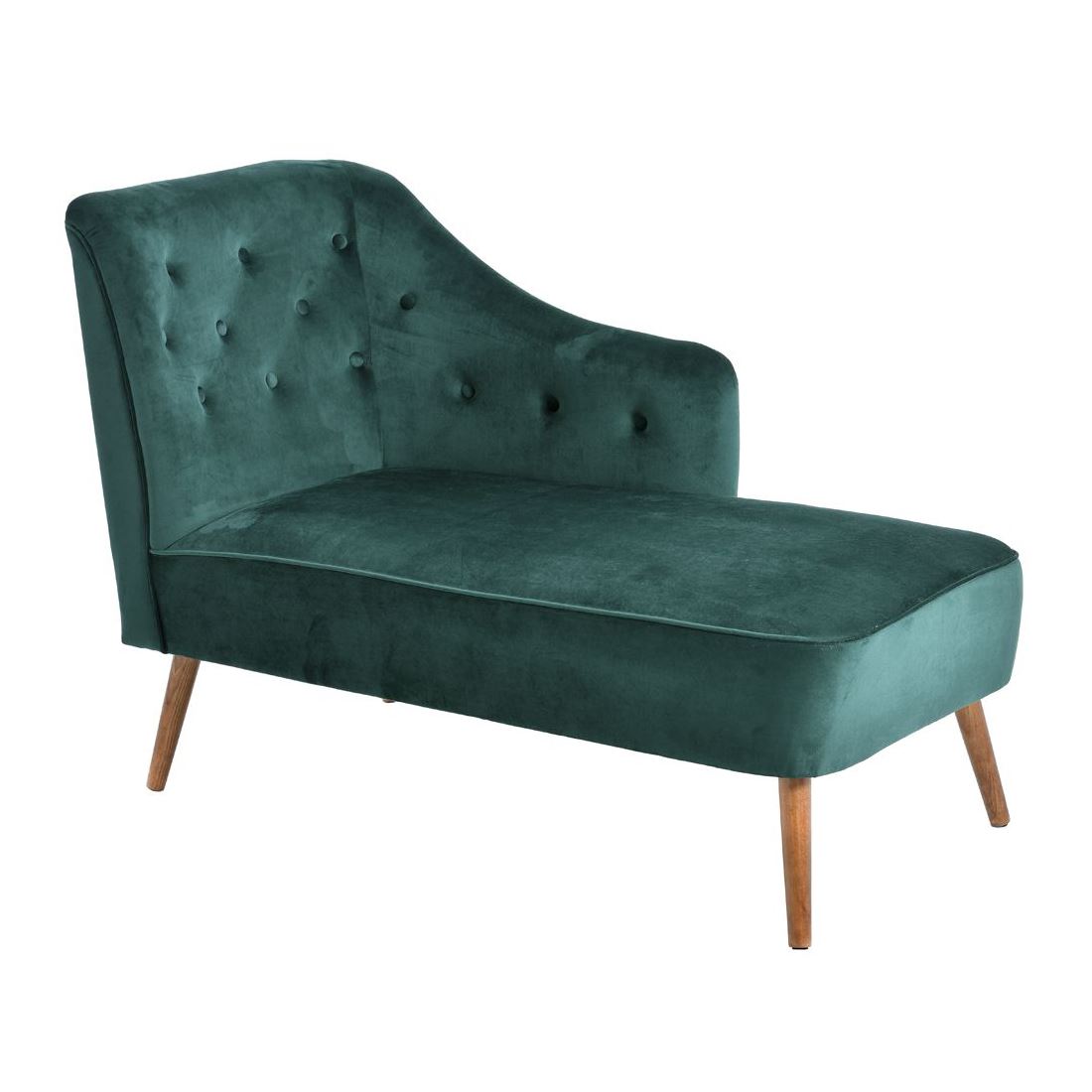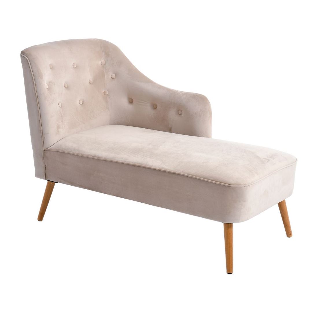 Стилна лежанка, изработена с дамаска от кадифе, декоративни копчета по облегалката и подлакътника и дървени крака в натурален нюанс.