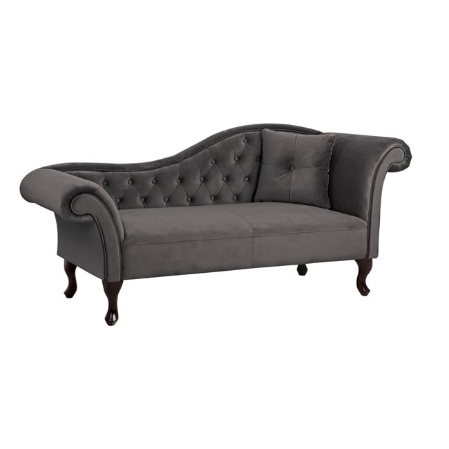 Лежанка-канапе в сиво кадифе с дървени крака и капитонирана облегалка.