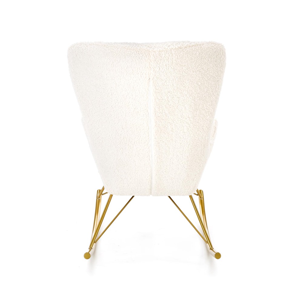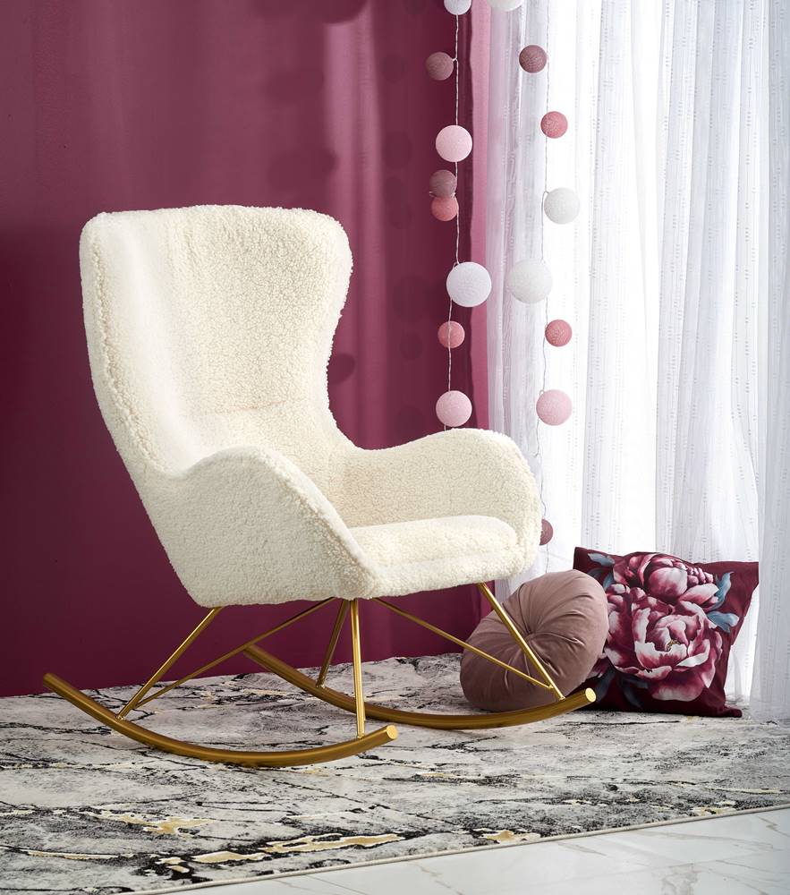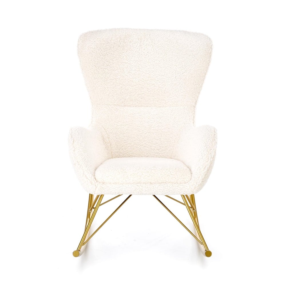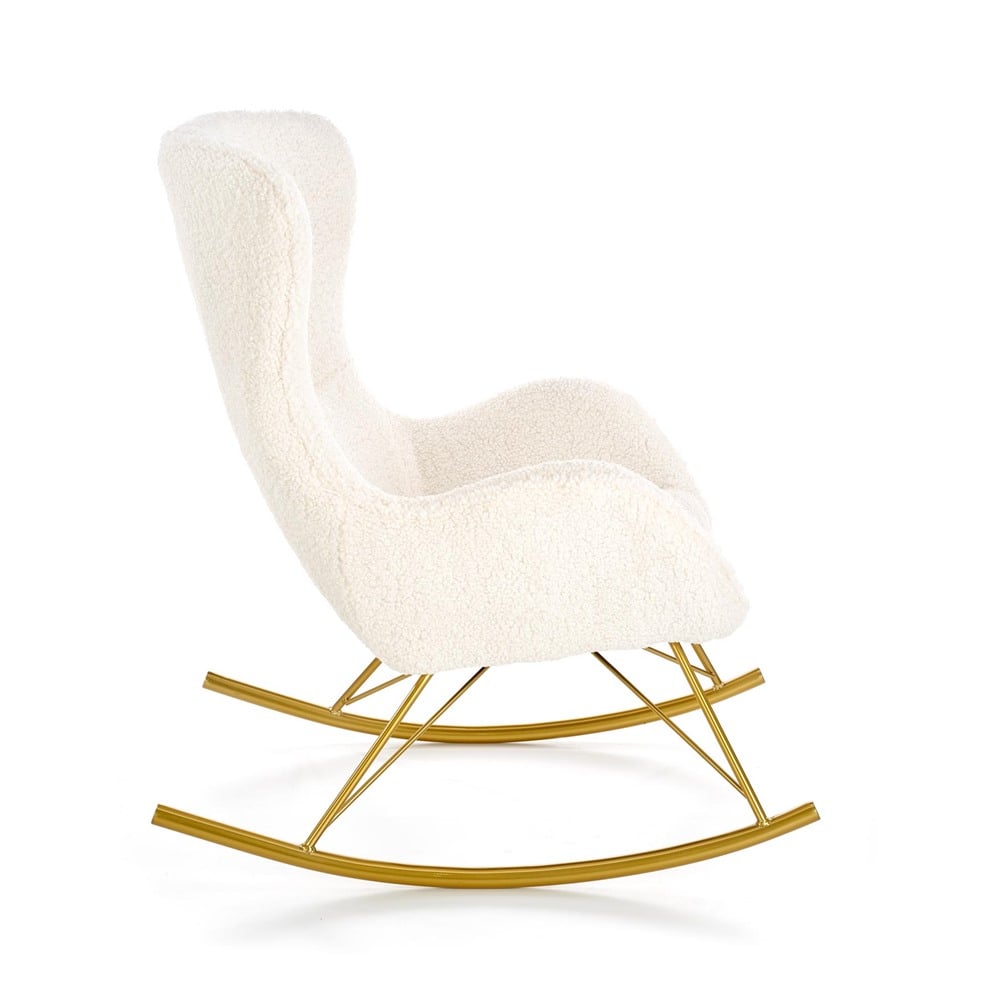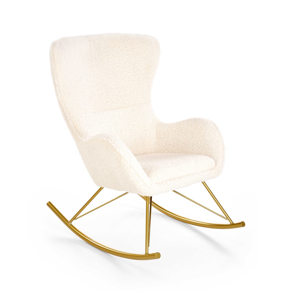 Люлеещо кресло със златисти крака и дамаска букле в цвят крем.