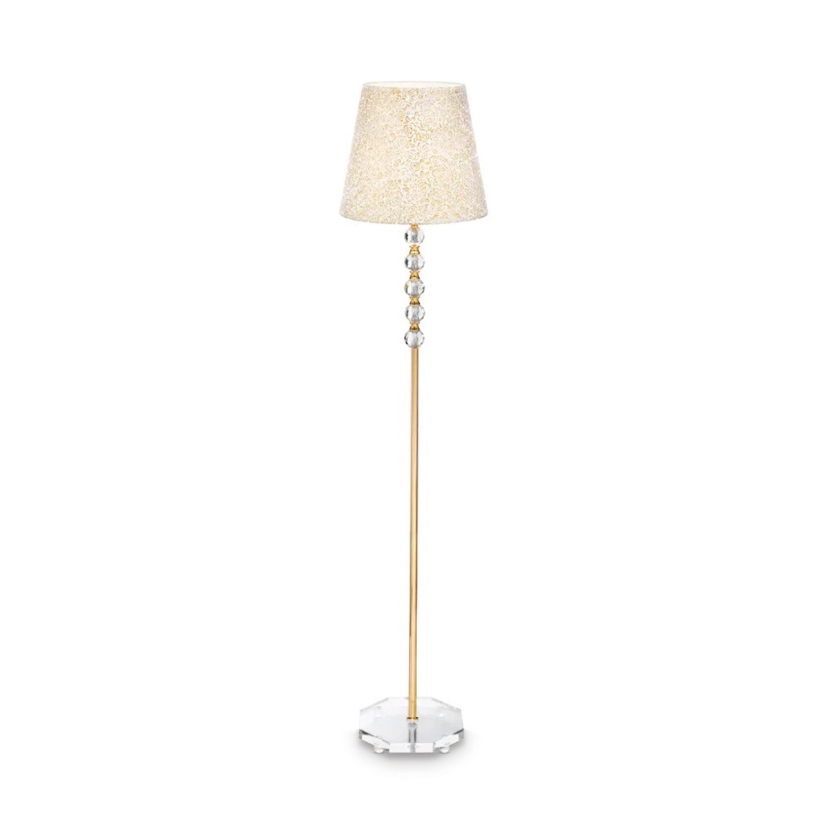Луксозен лампион с метална конструкция в златист цвят с фини декоративни елементи, Ideal lux серия Queen. Кристалната му основа нежно отразява светлината, придавайки на пространството изтънченост и ефектен блясък.