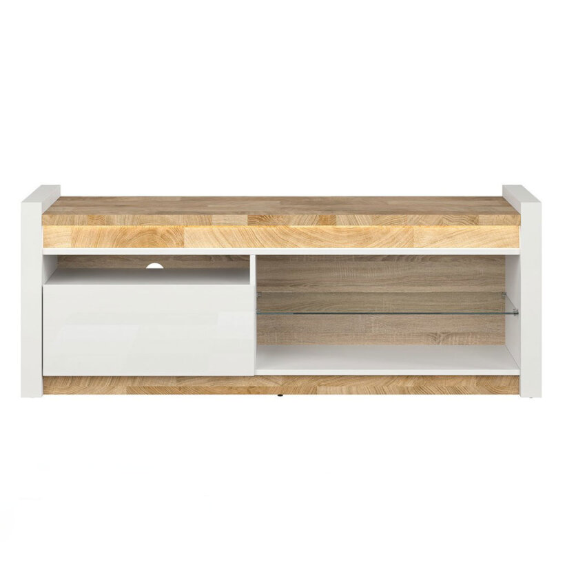 Луксозен ТВ шкаф, изработен от МДФ и ПДЧ с бяло гланцирано чекмедже, плот и детайли в цвят уестминстърски дъб, и стъклен рафт от модулна система Аламеда.