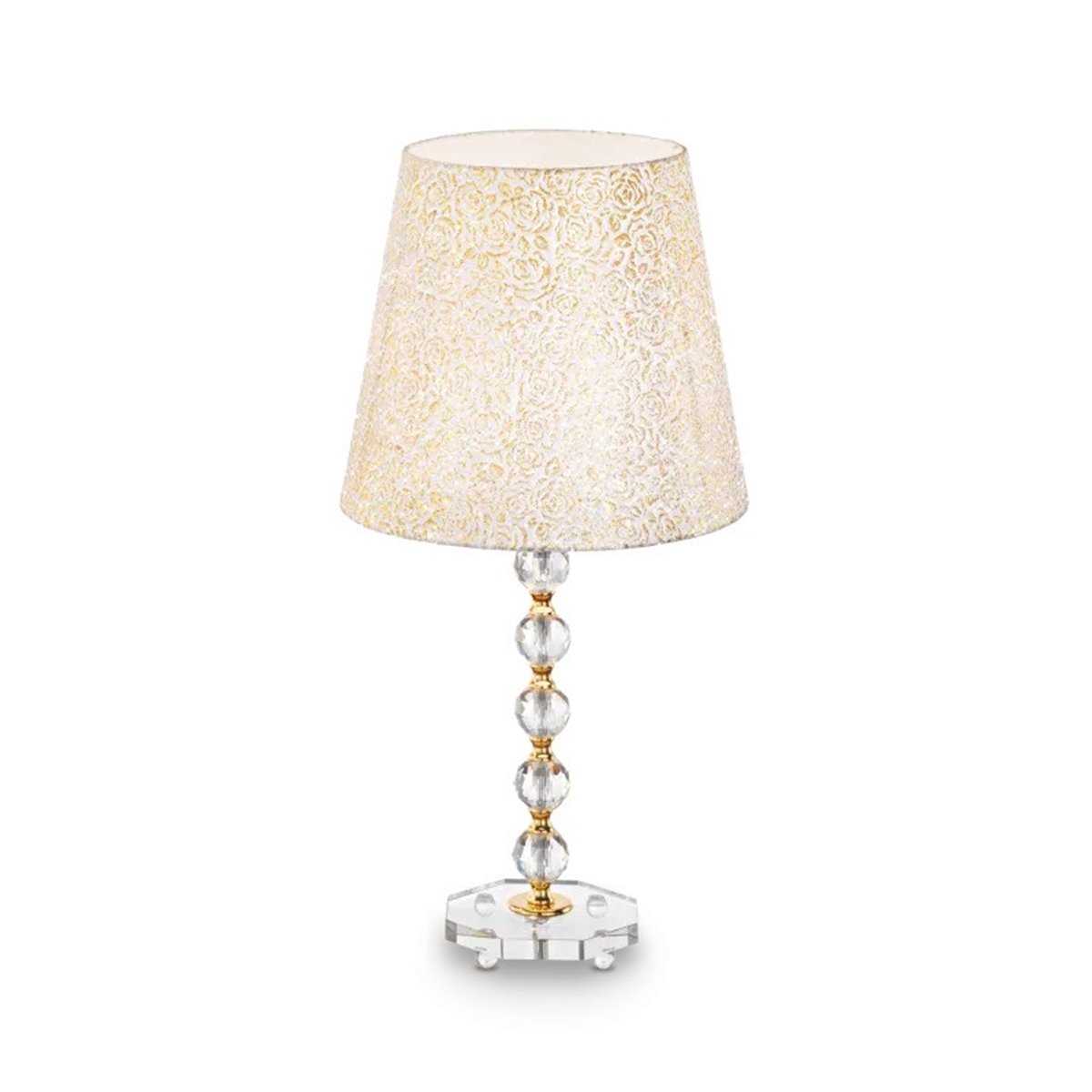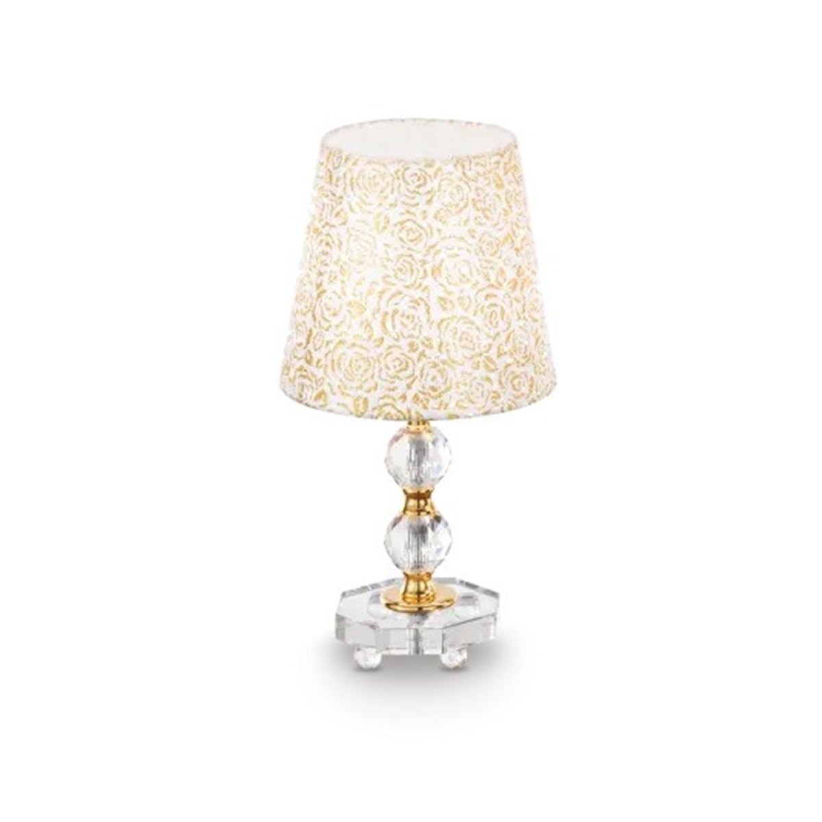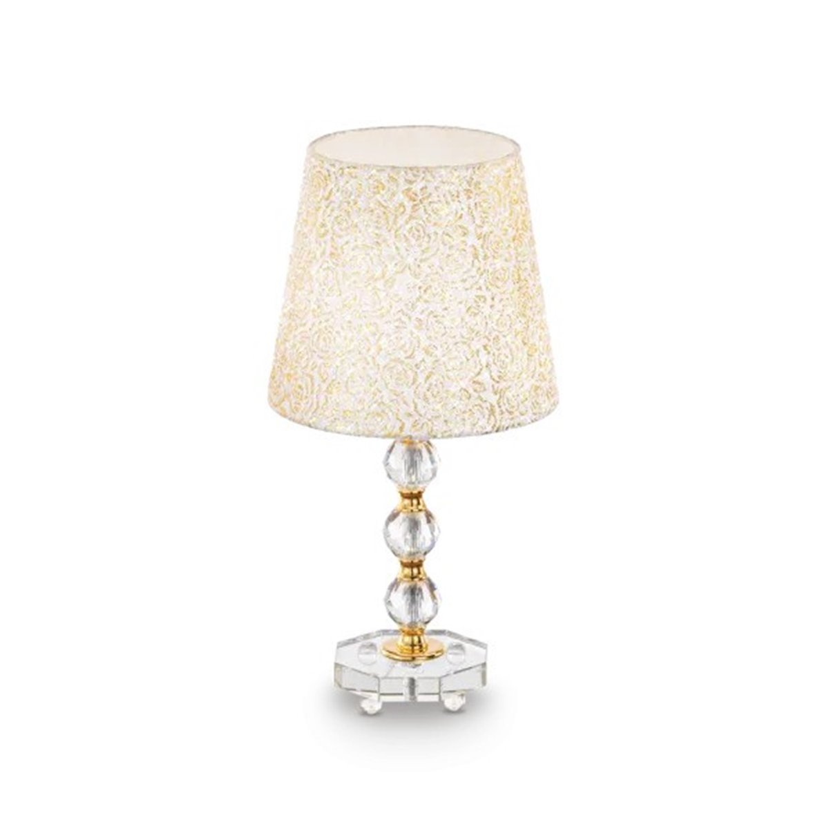 Луксозна нощна лампа, със стилен и елегантен дизайн, изработена от златна метална конструкция с фини декоративни елементи и кристална база, която нежно отразява светлината, Ideal lux серия Queen.