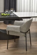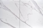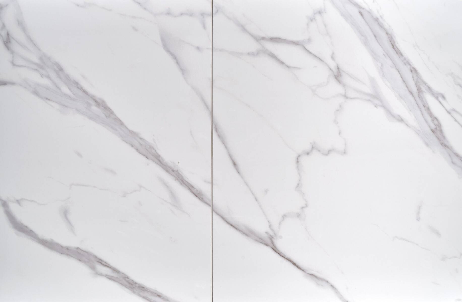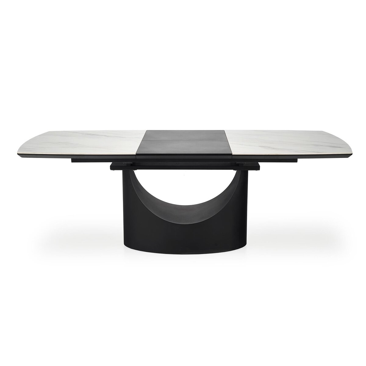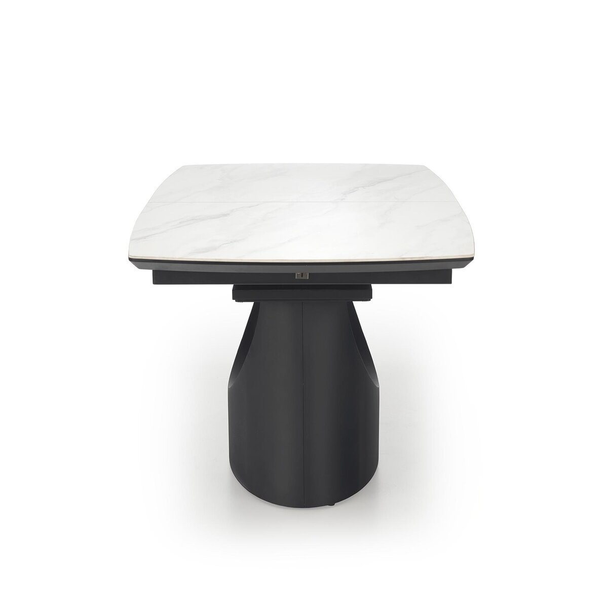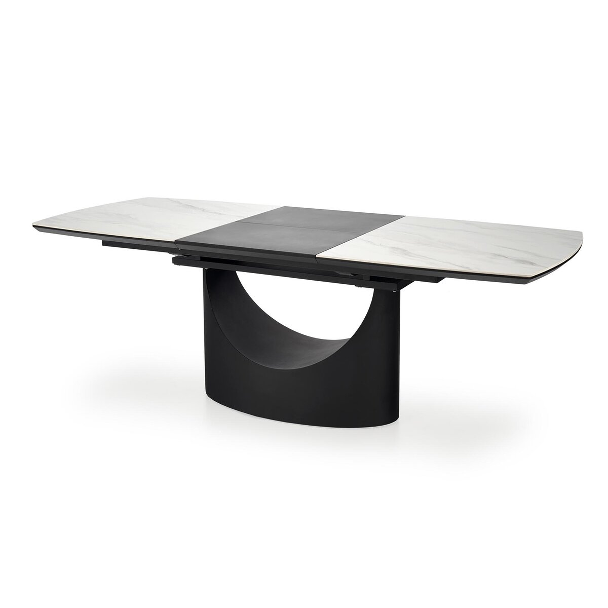 Трапезна маса с разтегателен плот имитация на бял мрамор и вдлъбната основа в черен цвят Остин.