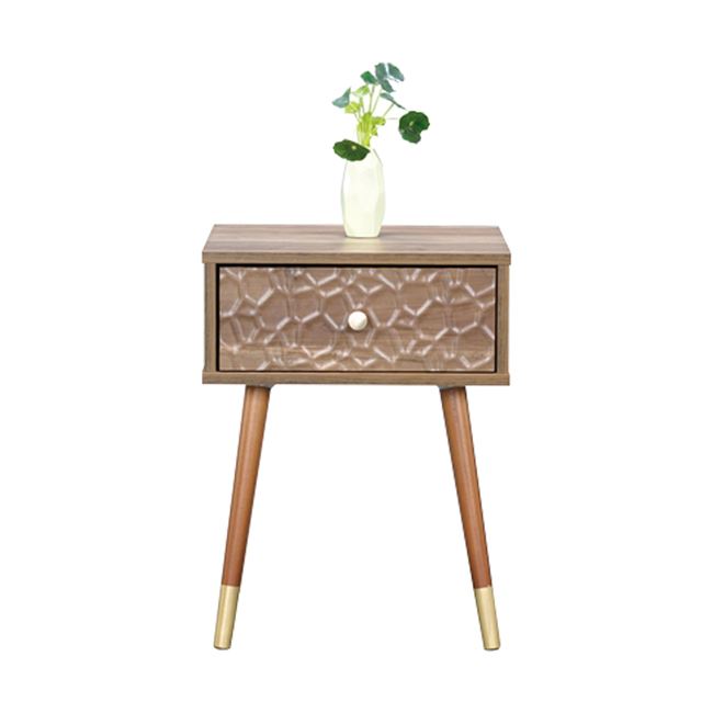Красива помощна масичка с едно чекмедже с интересна визия, изработена от ПДЧ с меламиново покритие в цвят орех и златисти детайли по крачетата, серия Шани.