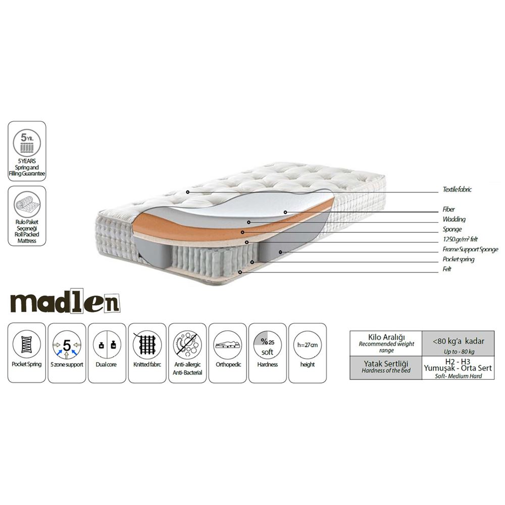 Комфортен матрак с 5-зонова покет пружинна система, която е формирана от подредени пружини с различна твърдост, съответстващи на анатомичната структура на тялото и по този начин осигуряват нужната опора в различните му части.