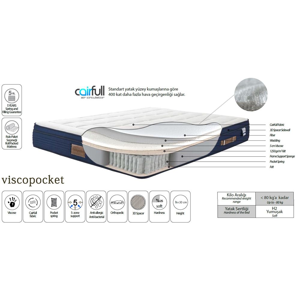 Удобният матрак с височина 30см е изработен с вискозни нишки и двойна покет система с различна твърдост, която се адаптира към тялото независимо от теглото му.