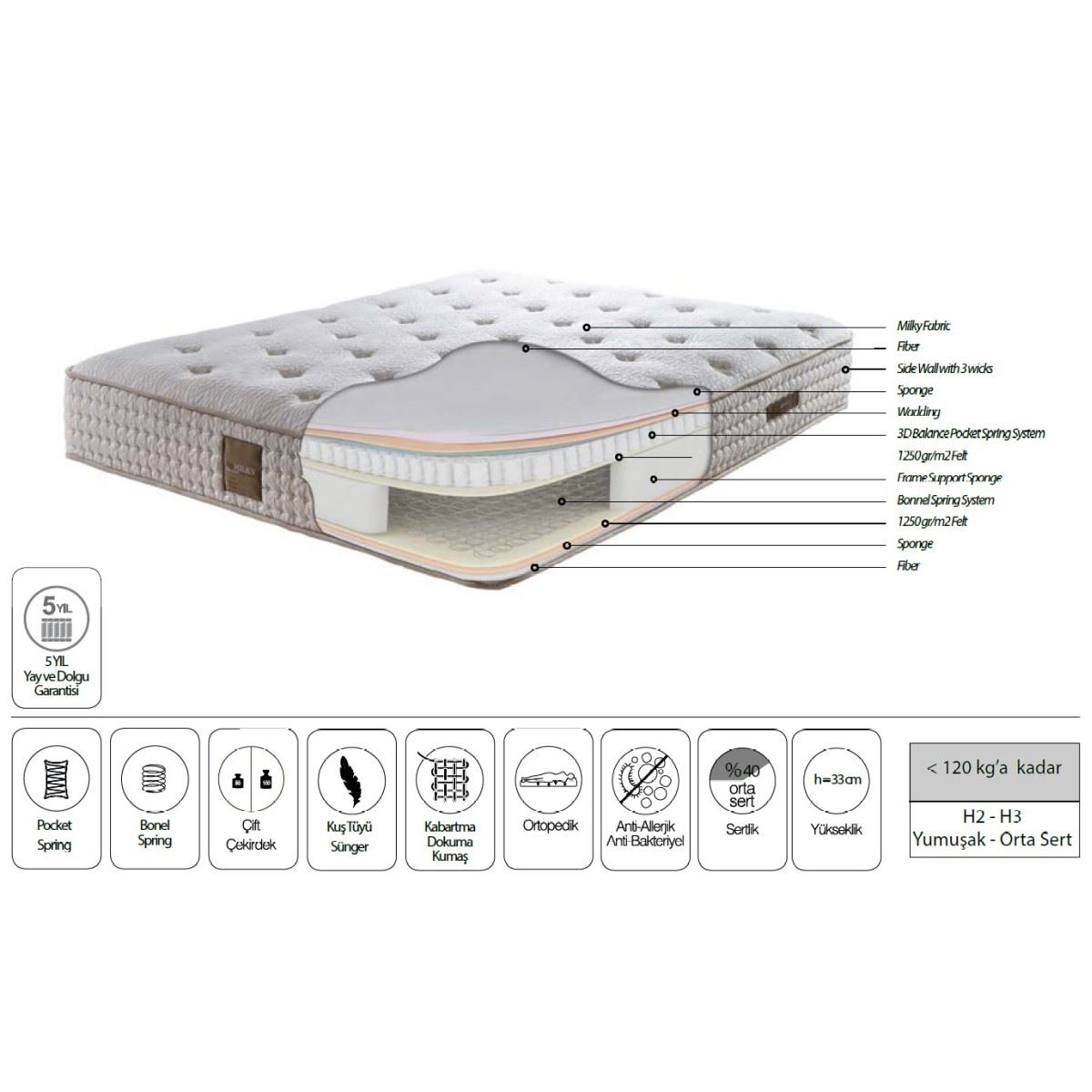 Моделът е с височина 33 см и разполага още с двуядрена функция, която спомага за равномерното разпределяне тежестта на партньорите. Предлага се в размери 120 х 200см, 140 х 200см, 160 х 200см и 180 х 200см и е със степен на твърдост мек до средно твърд.