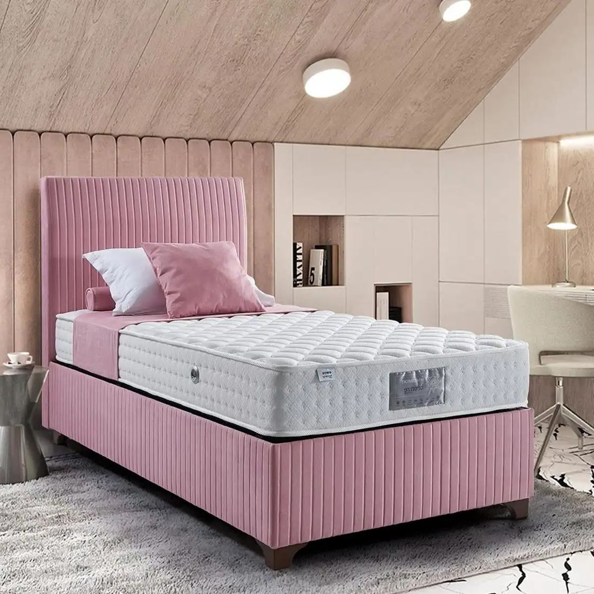 Пружинният пакет е обвит с твърд филц с плътност 1250 г/м² и допълнен с борд от полиуретанова пяна за оформяне и устойчивост. Над пружинната система са разположени слоеве от пяна с висока плътност, омекотителна вата, мека пяна и полиестерна вата, които участват в равномерното разпределение на натиска.
