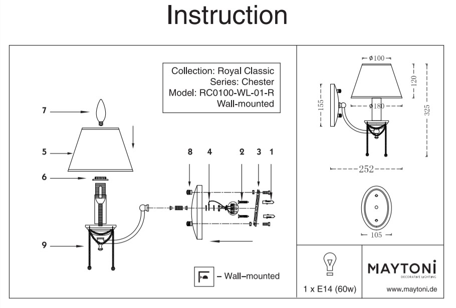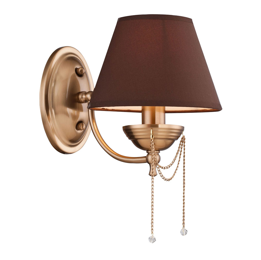 Метален аплик в цвят месинг с извито рамо, декоративни висулки и кафява PVC шапка от текстил в конусовидна форма Maytoni, серия Chester.