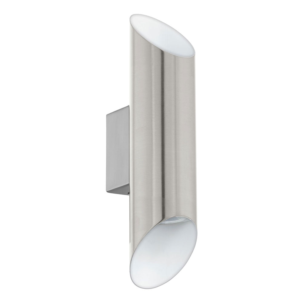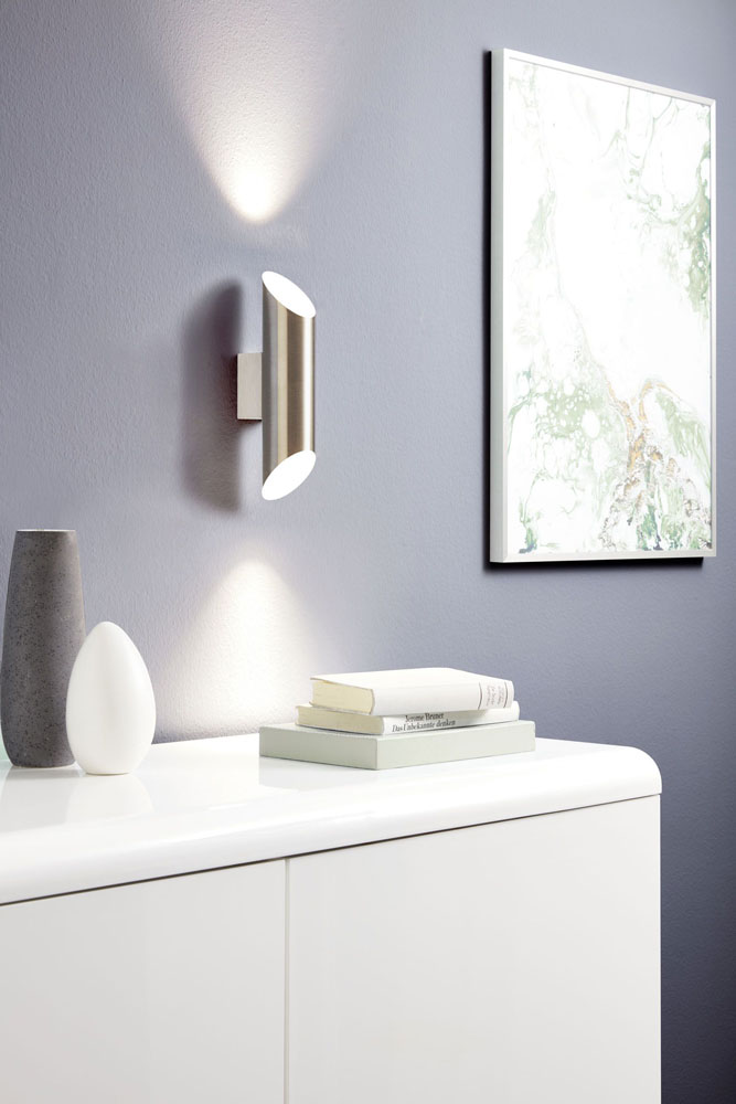 Цилиндричен LED аплик със скосени краища, изработен от стомана в цвят никел мат и лъскаво бяло, Eglo, серия Viegas.