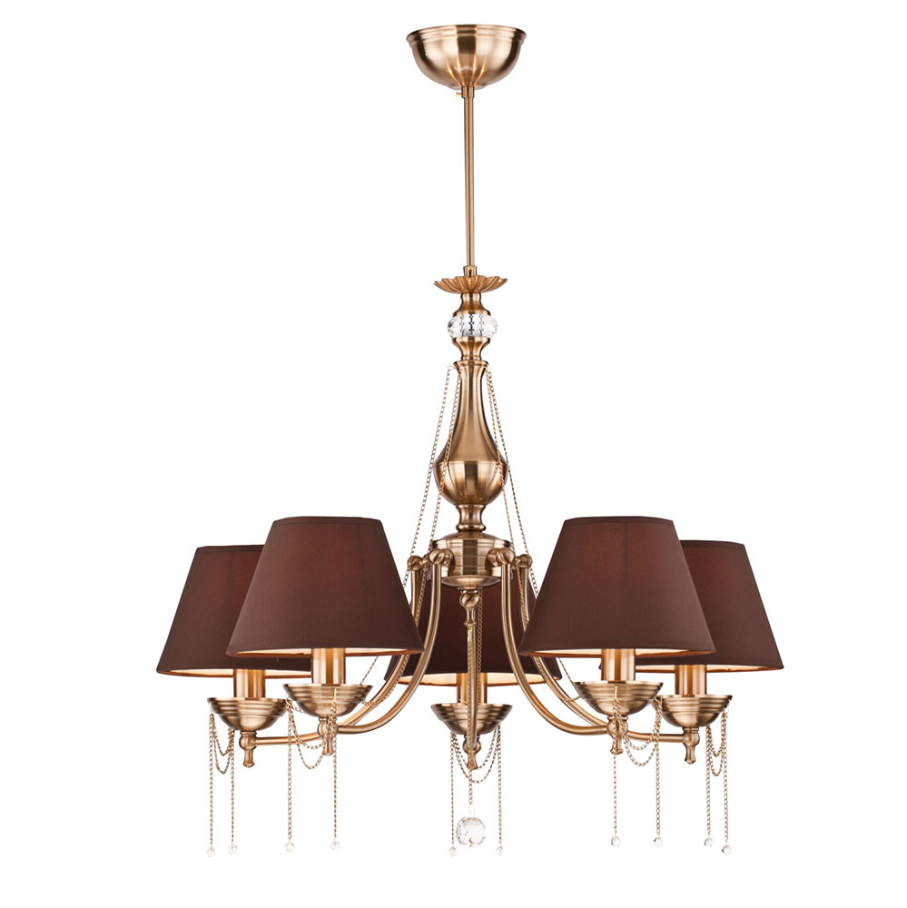 Метален полилей в цвят месинг с декоративни висулки и 5 тела с кафява шапка от текстил в конусовидна форма Maytoni, серия Chester.