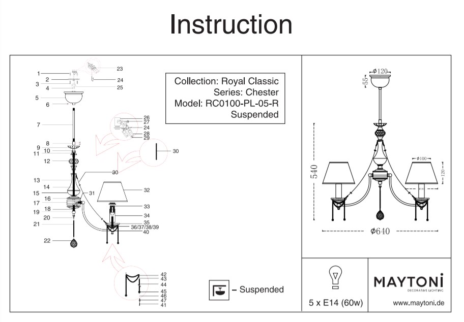 - Размери: шапка – ∅ 10/18 х 12 см, ширина – ∅ 64 см, височина – 70-94 см, основа – ∅ 12 х 5,5 см, дължина верига – 32,5 см
