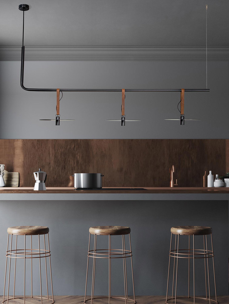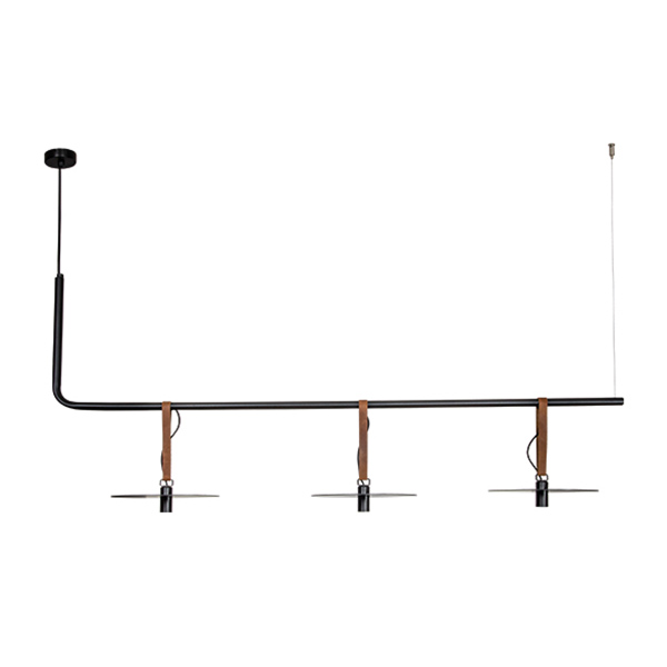 Минималистичен LED пендел в черно с дълго рамо от метал и три нестандартни тела висящи на колани от кожа Zambelis, серия Megara.
