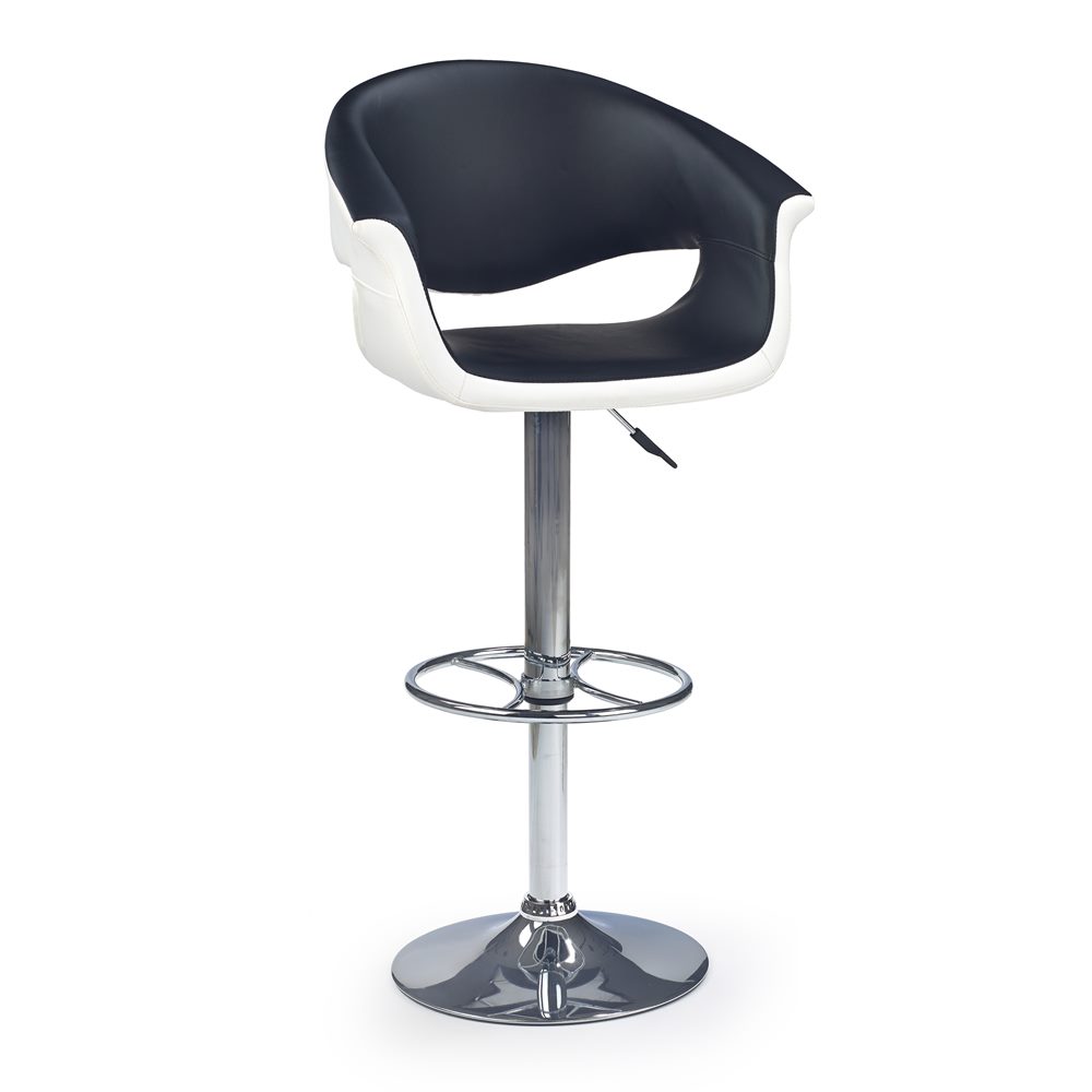Модерен бар стол в бяло и черно с повдигащ механизъм и място за стъпване.