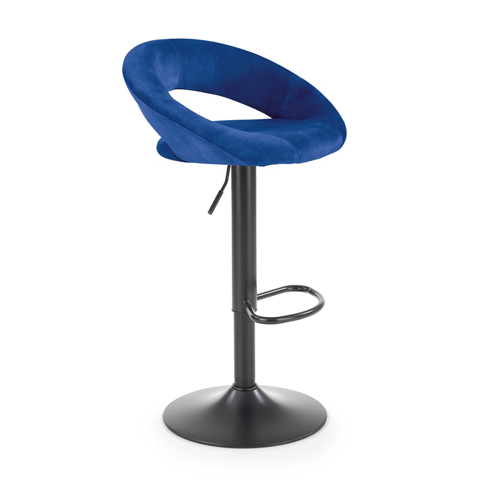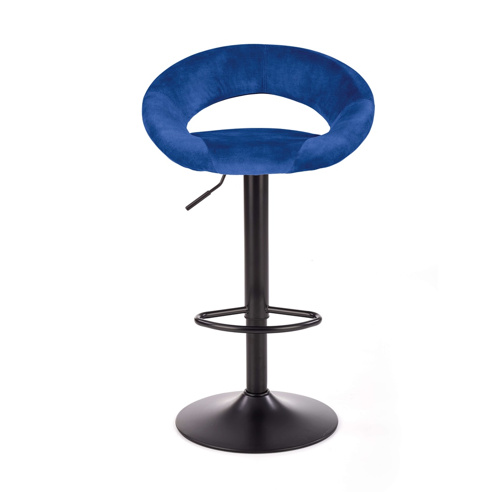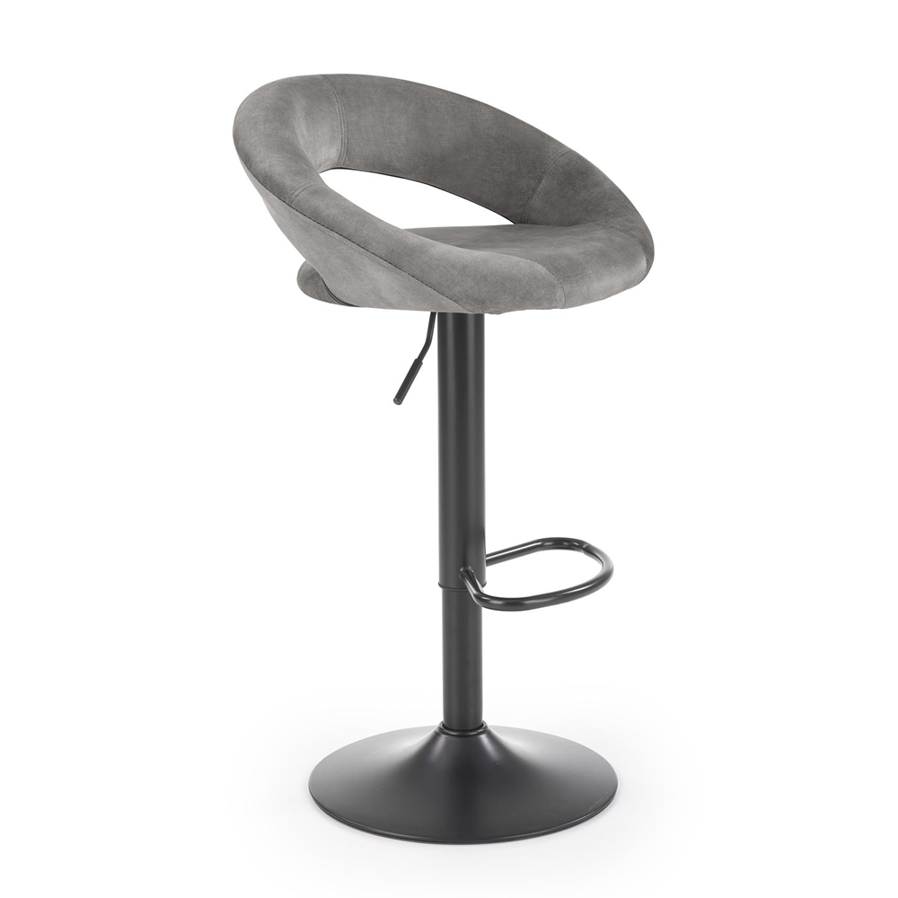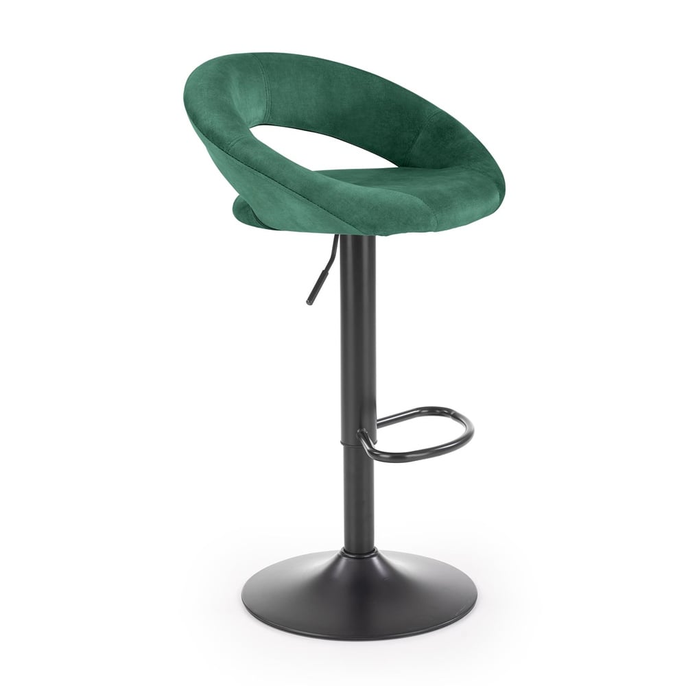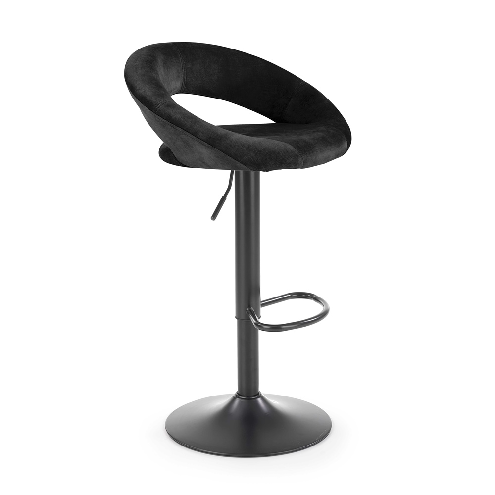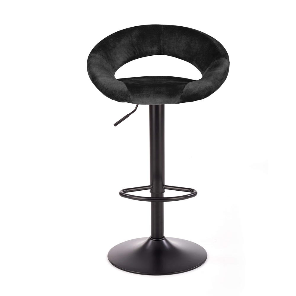 Модерен бар стол с тапицерия от кадифе и регулираща се основа от черен метал.