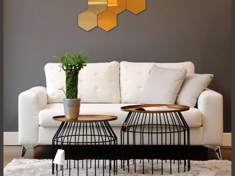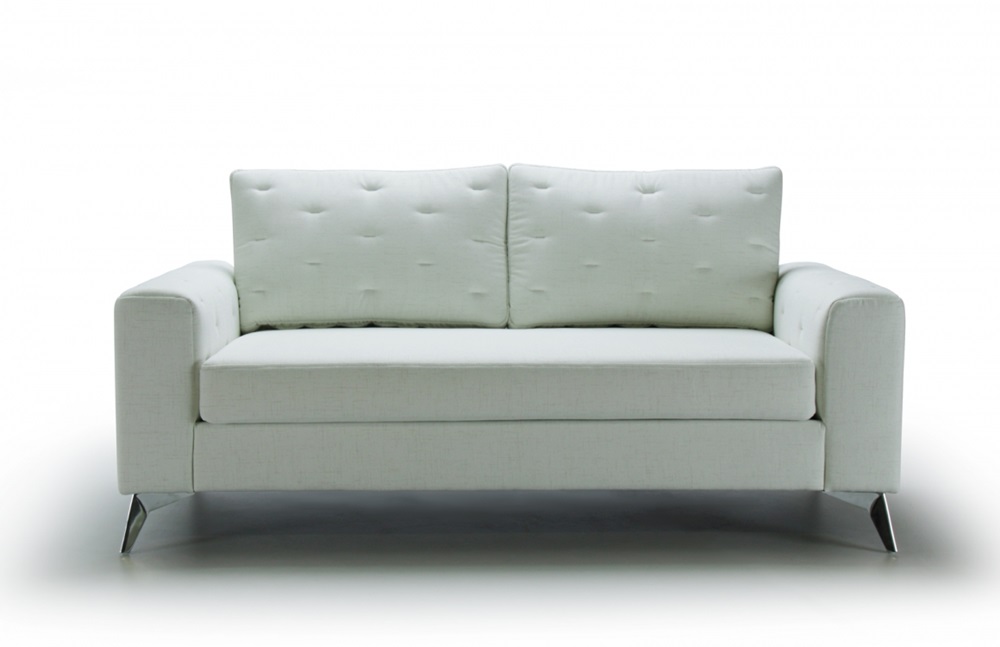 Модерен двуместен диван с текстилна дамаска в бяло и метални крачета.