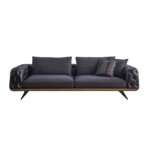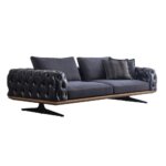Модерният нисък диван Amber е с елементи на класическия стил Честърфийлд – красиви капитонирани подлакътници и гръб от еко кожа.