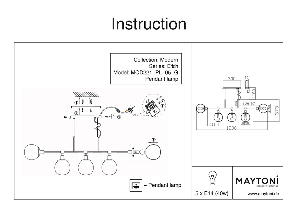 Модерен пендел с 5 стъклени сфери Erich в цвят месинг - схема