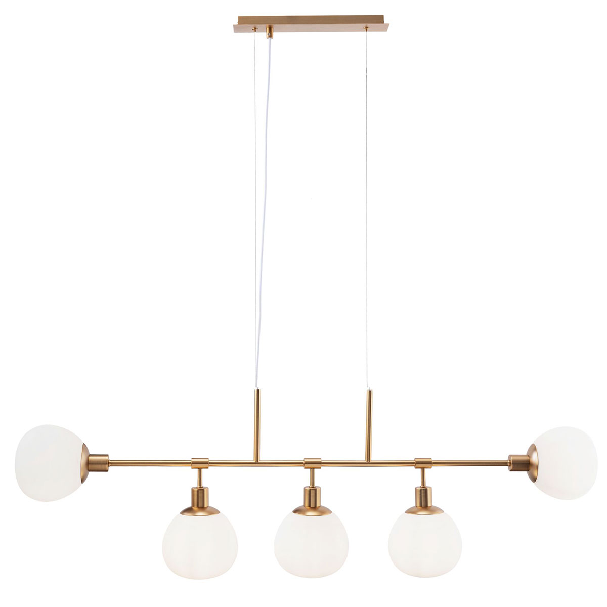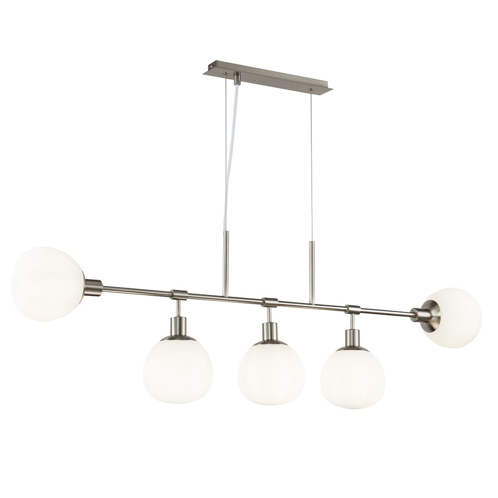 Модерен пендел, изработен от метал с продълговата основа и пет сферични стъклени тела в бял цвят Maytoni, серия Erich.