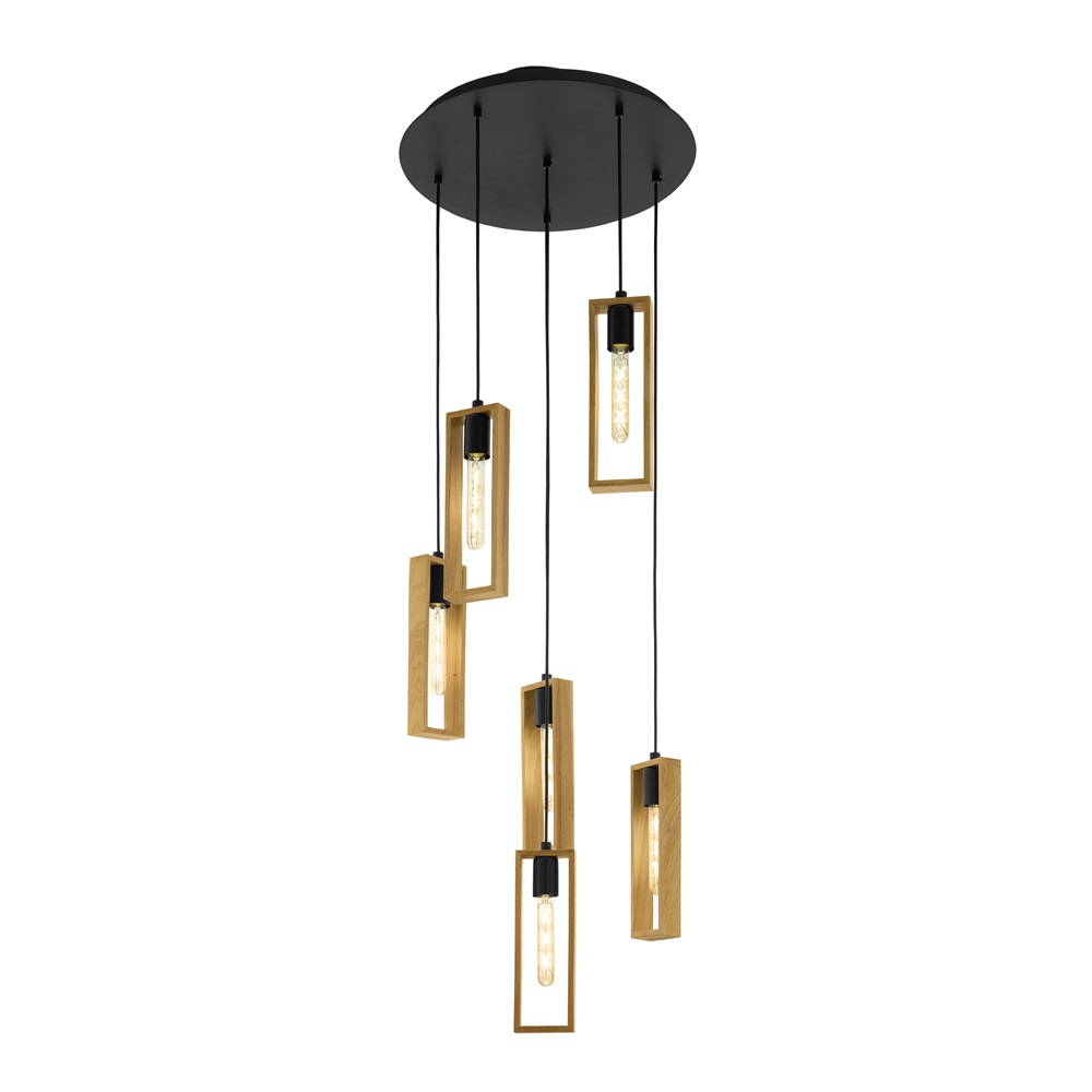 Модерен полилей от дърво и метал с шест асиметрично разположени крушки на кръгла основа, Eglo серия Littleton.